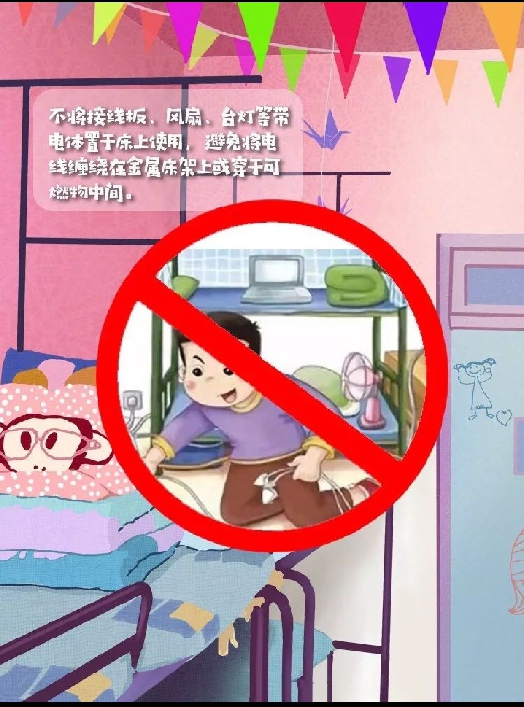 3.不随意在宿舍内更改、折卸、安装电源线路、插座、插头等,也不要把铁钉等硬物凿入墙面,以防发生电线短路、触电等意外事故。