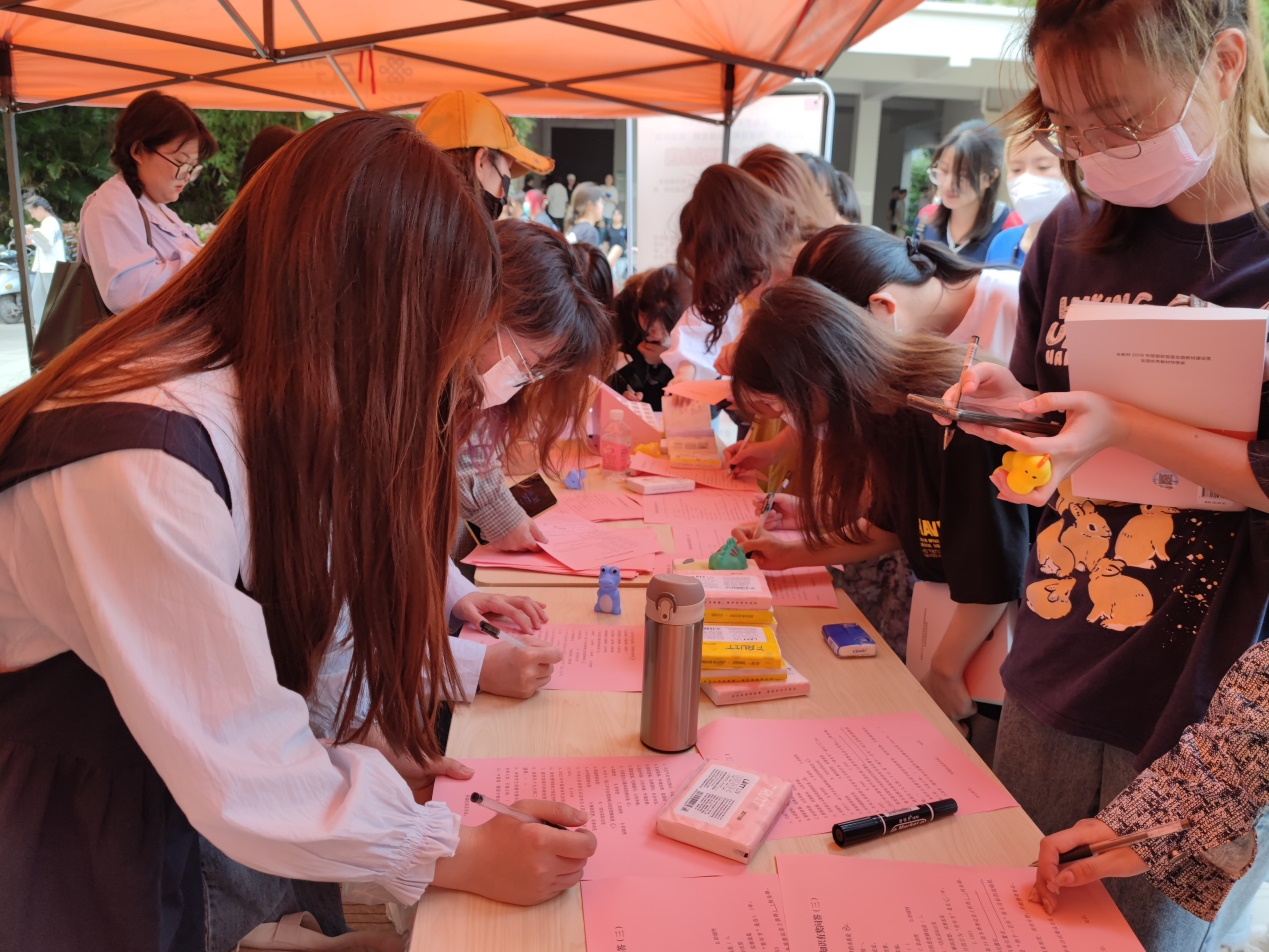 同学们在工作人员的耐心讲解下,积极参与到活动中,现场答卷、扫码参与线上活动、报名参加线下活动,热闹而有序。
