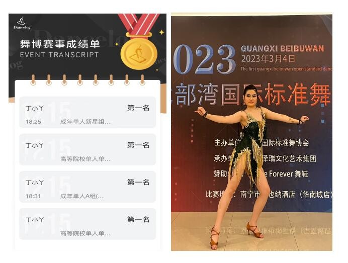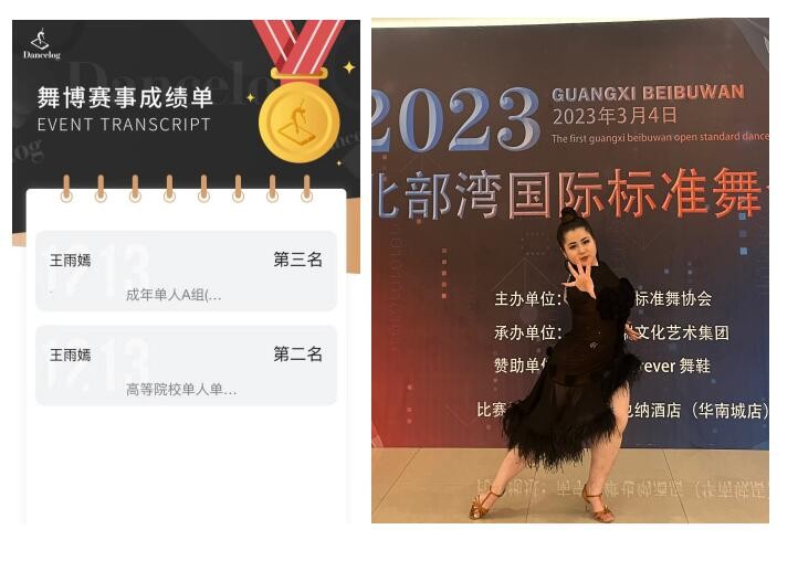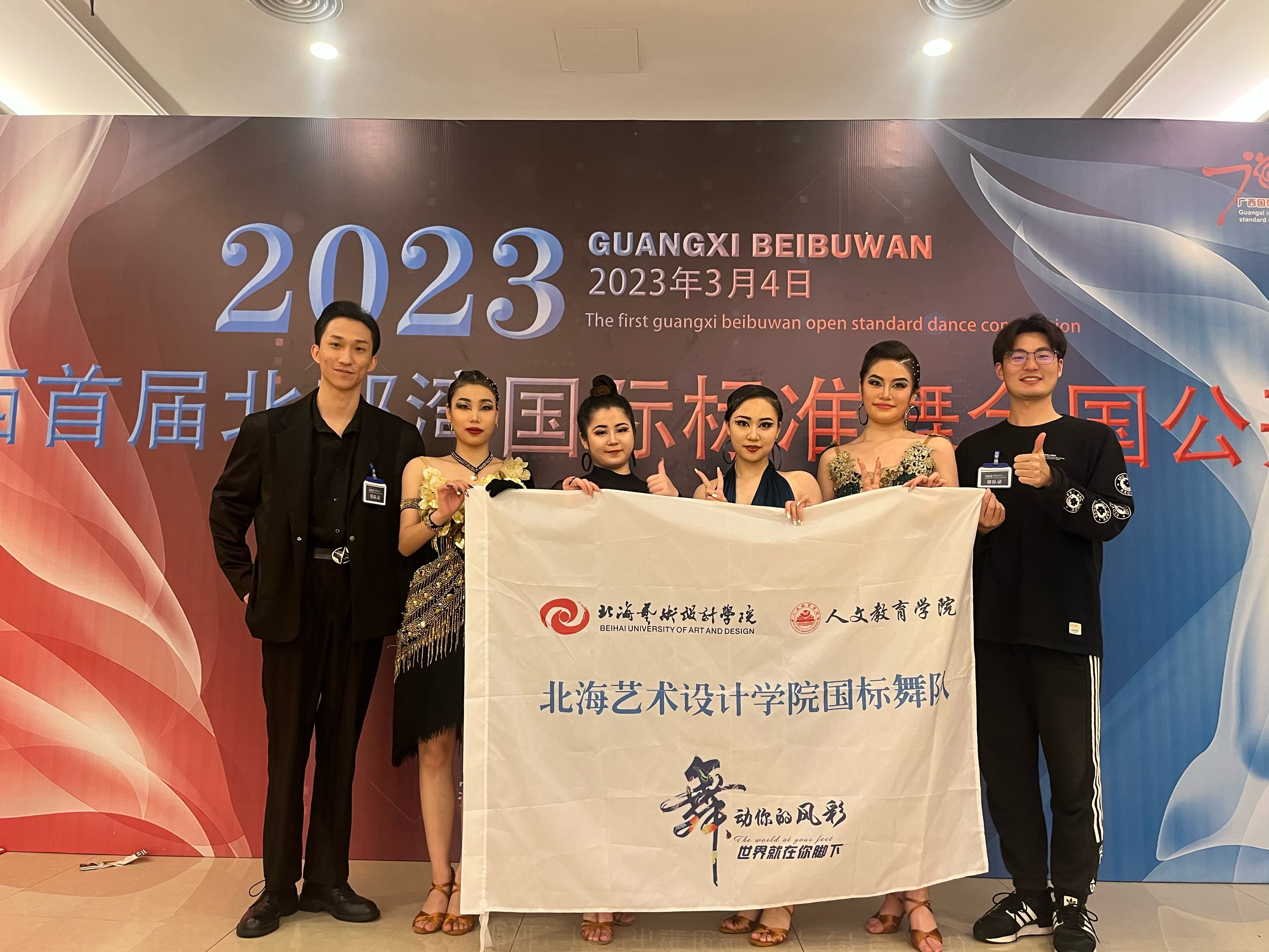 2023年3月4日,中国·广西首届北部湾国际标准舞全国公开赛在广西南宁正式开赛。由人文教育学院舞蹈表演专业(国标舞兼修)学生潘宏、丁小丫、王雨嫣、王雨桐组成的北海艺术设计学院国标舞代表队,在青年教师李晓飞和周琦涵的带领下出战,一举斩获8项冠军、2项亚军、2项季军、1项殿军。