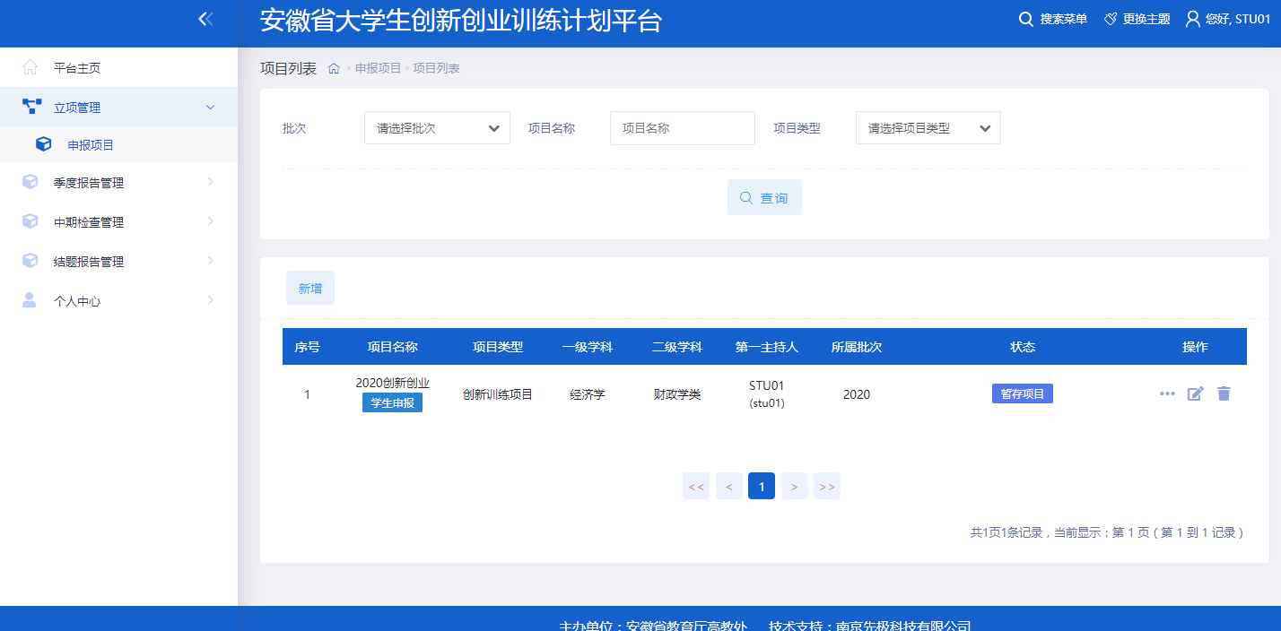 平台地址:http:114.220.75.43:1008、(选择“访问新版”)初始帐号默认为学生学号,初始密码为默认为账号(学号)+@cxcy,账号(学号)详见“拟立项项目名单公示”。在浏览器输入平台地址(建议使用谷歌、火狐、360浏览器极速模式),点击页面中的“学生登录”,输入对应的账号和密码进行登录。进入角色的后台管理界面完善相应的项目信息。