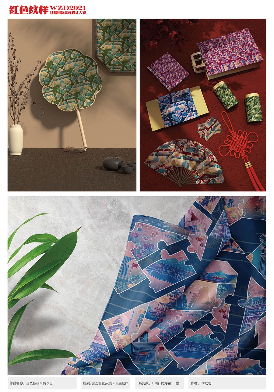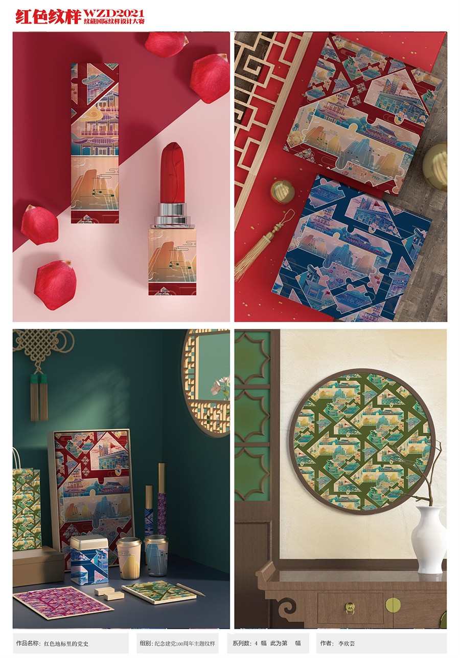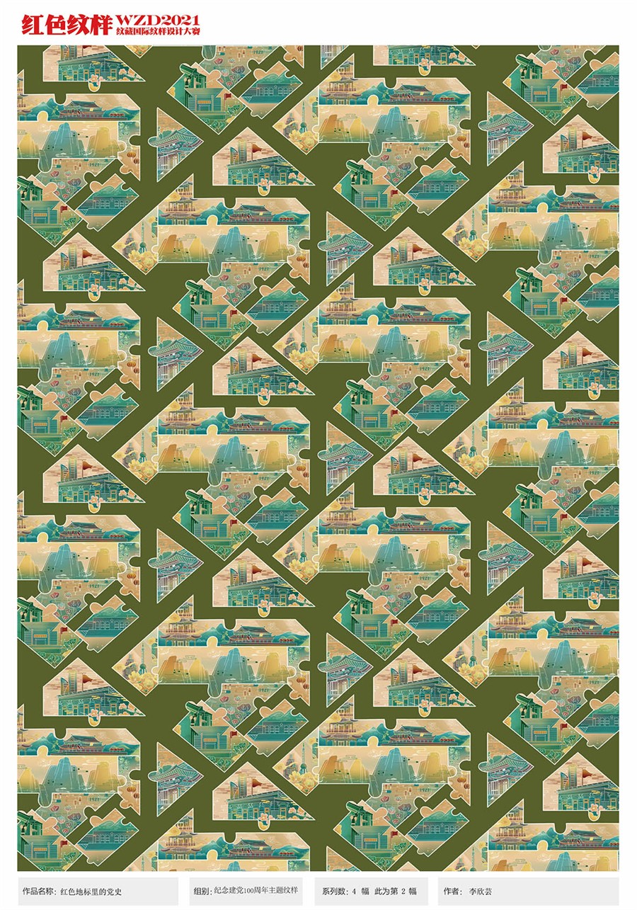 《红色地标里的党史》系列纹样设计以拼图的形式去描绘党的艰辛历程和一路走来的艰难险阻。整体运用了中国风的风格,底图采用中国传统纹样做背景,象征着中国民族的精神,虽饱经沧桑、历经风雨,但如今依然屹立在世界民族之林。纹样以江西、延安、北京、上海等众多红色革命根据地拼接而成,是中国共产党革命精神的象征,即对理想和信念执着追求的力量之源。我们坚信中国共产党将继续带领中华民族走向繁荣。
