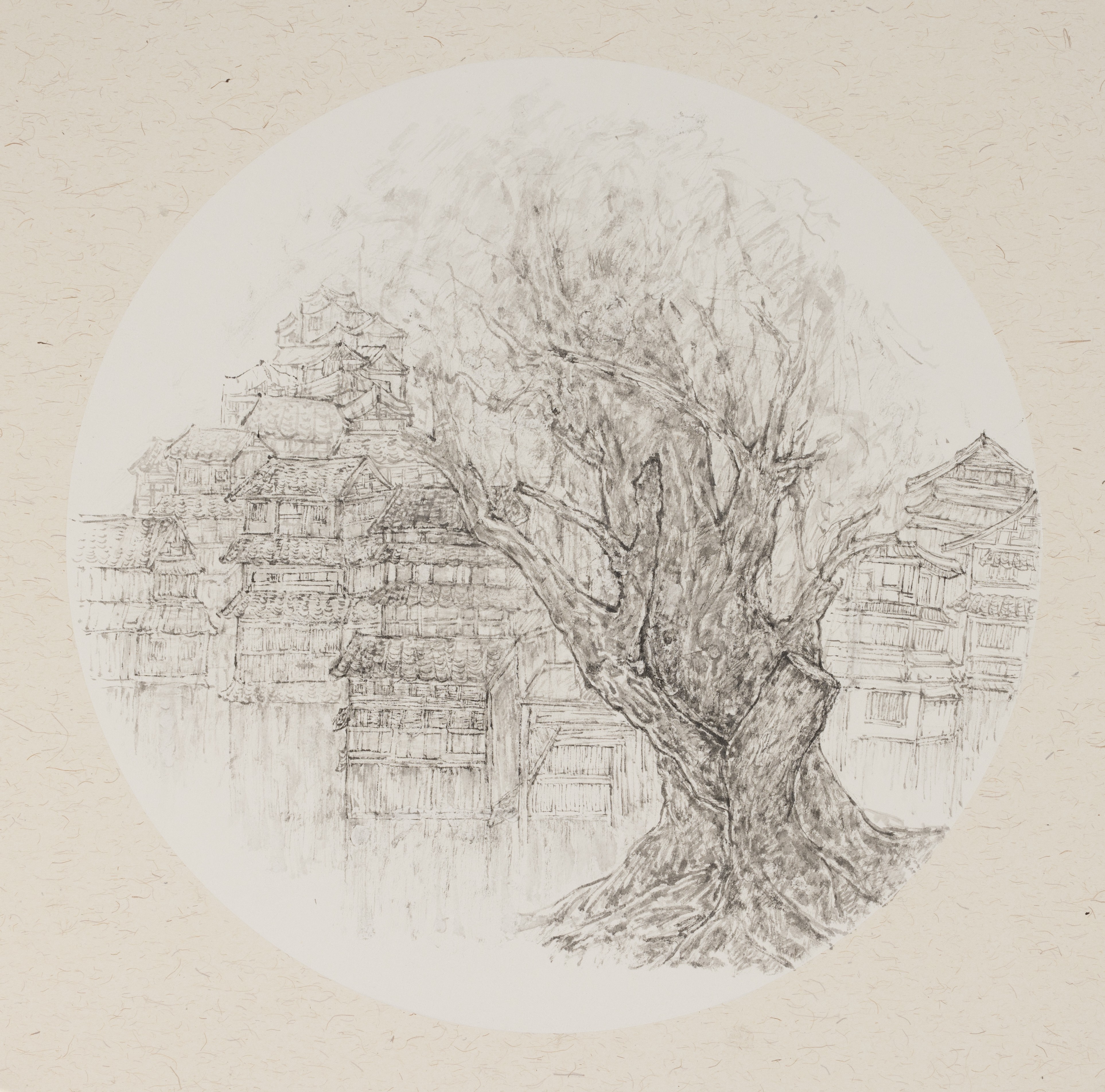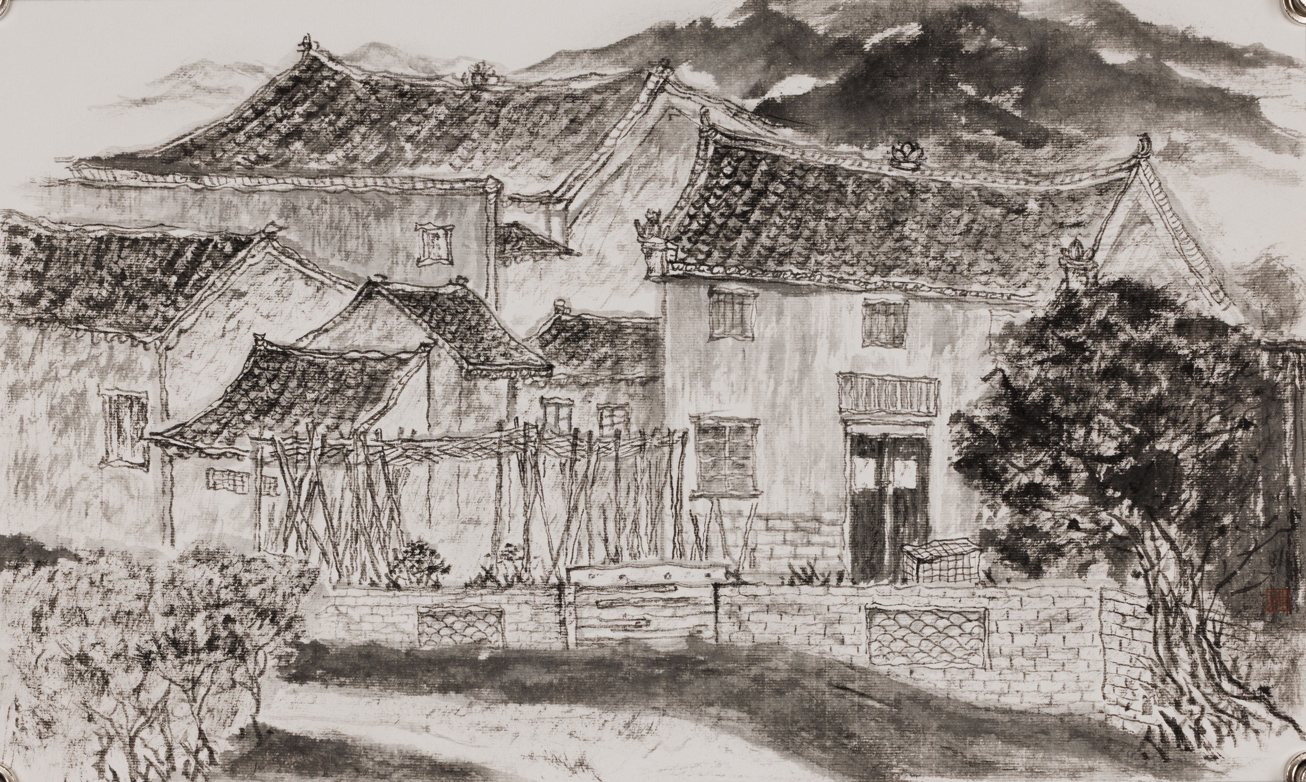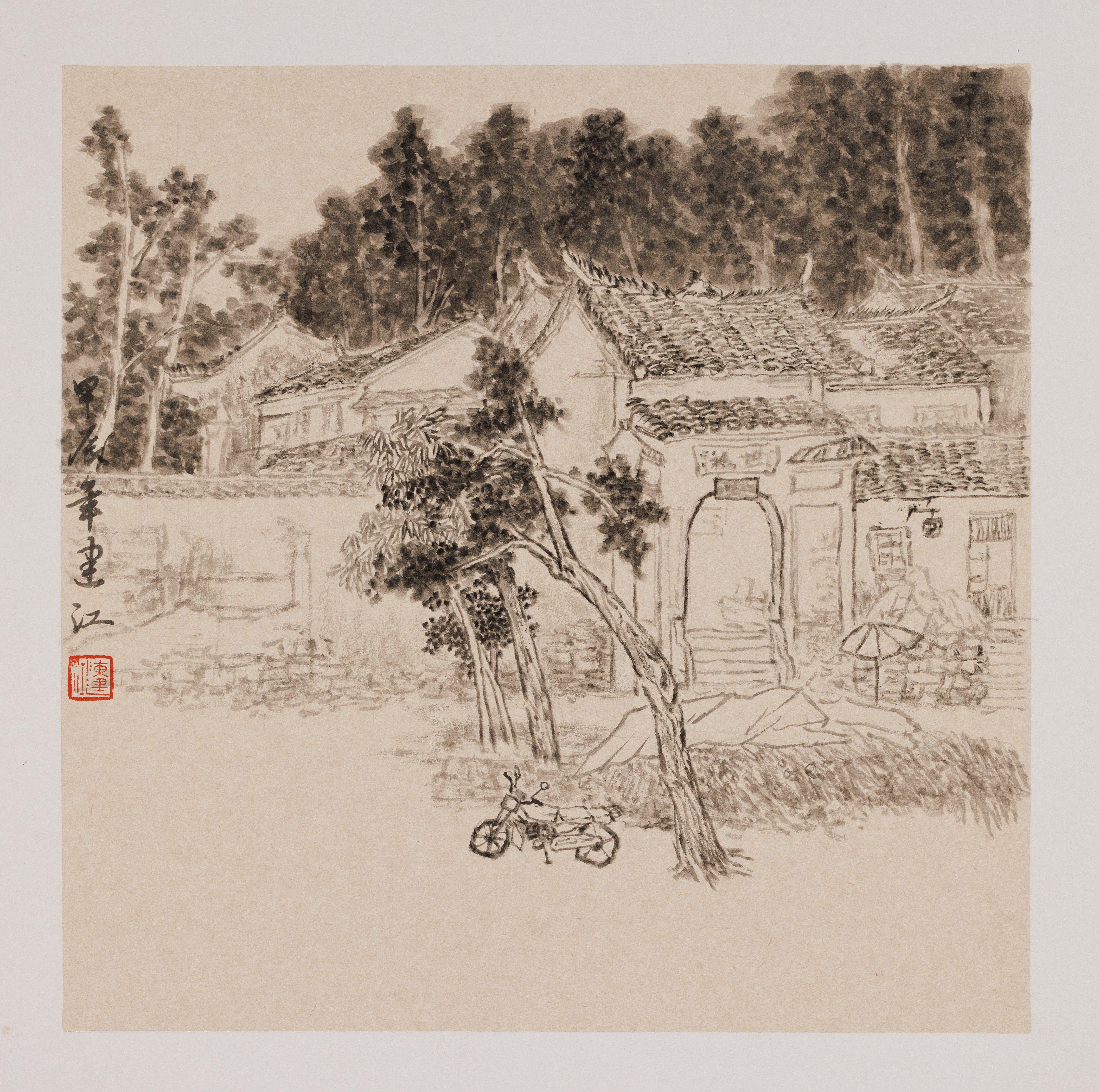 周彬彬,绘画专业,《树影鼓寨》,50x50cm,中国画
