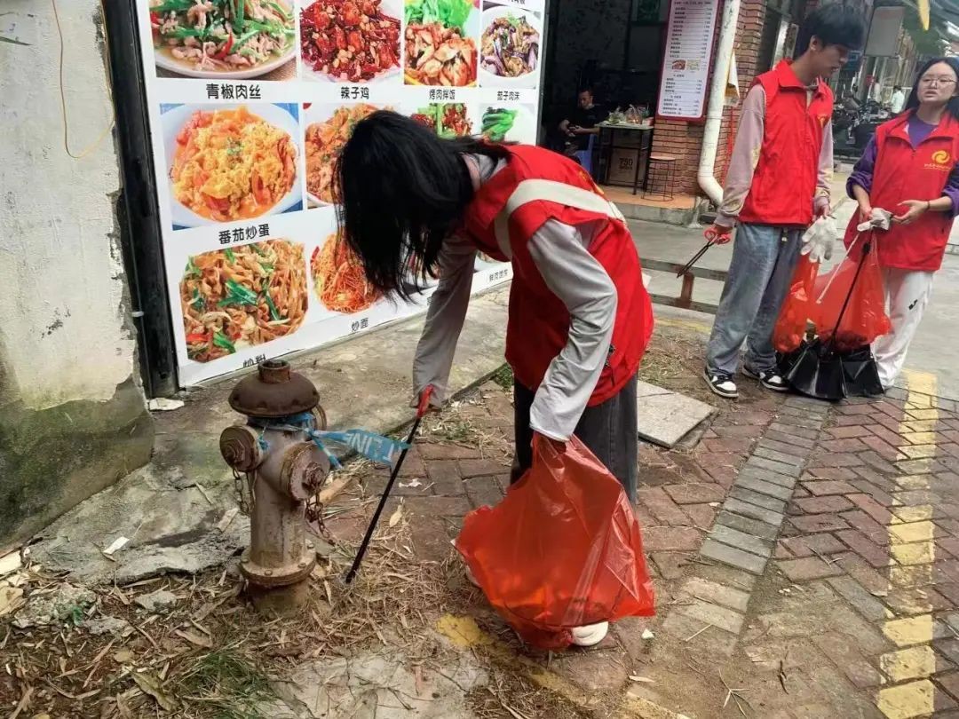 志愿者整装完毕,手持垃圾袋、钳子等清洁用具在学校周边开始行动,对绿化带、人行道等地方进行着重清理,用实际行动让街道恢复了原本干净整洁的样子。