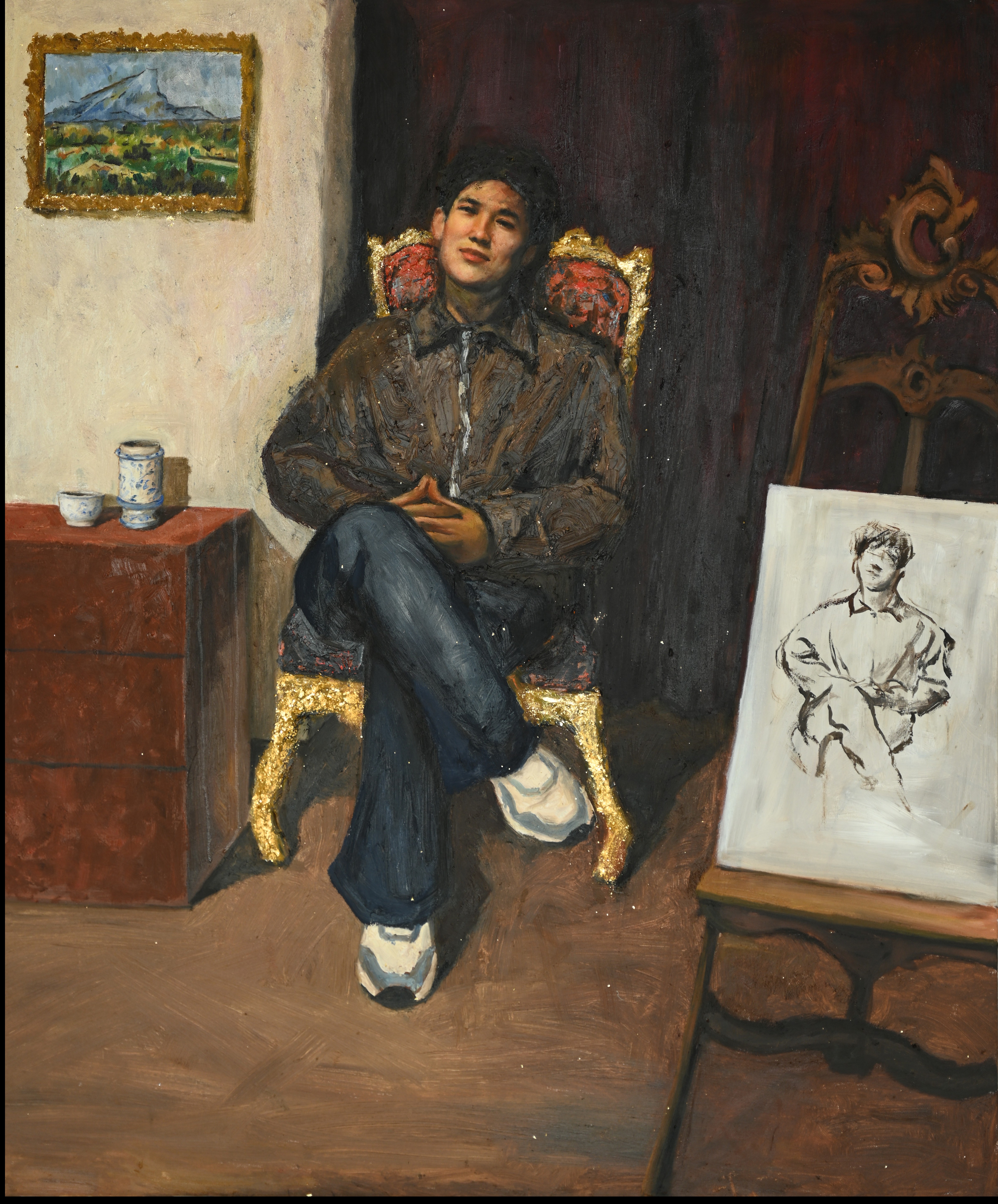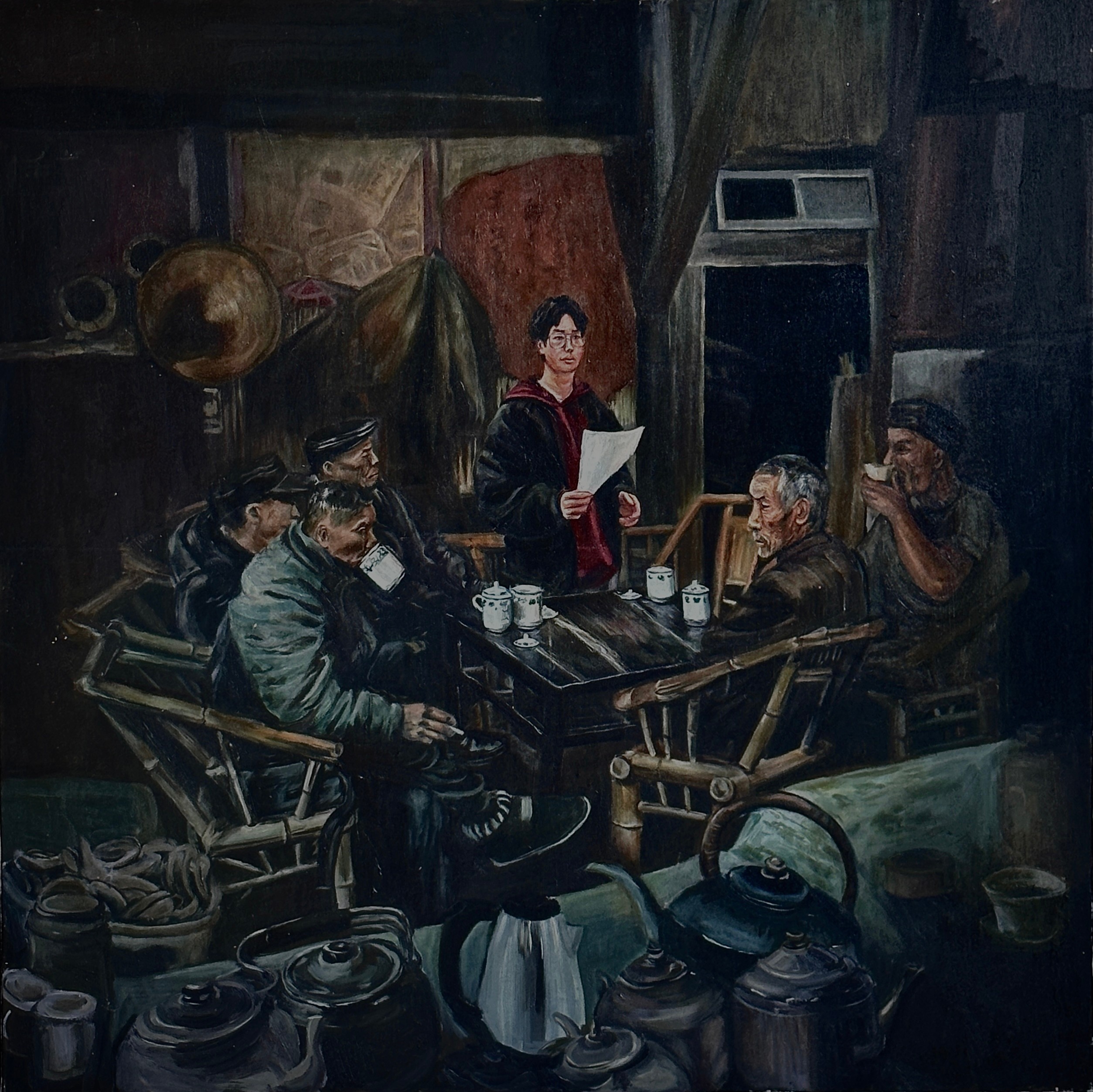 绘画2103班 冯越超 《茶韵时光:青春与岁月的碰撞》 120×120cm 指导教师:龚为、谢瑞