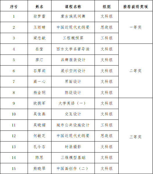 根据《关于开展北海艺术设计学院第八届青年教师教学竞赛的通知》(北艺人发〔2023〕12号),经个人申报、二级学院推荐,学校于6月7日举办了北海艺术设计学院第八届青年教师教学竞赛校赛。经专家评审,共评选出一等奖3人、二等奖5人、三等奖7人,现将比赛结果予以公示。