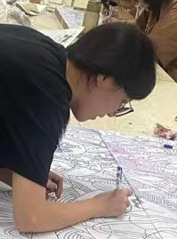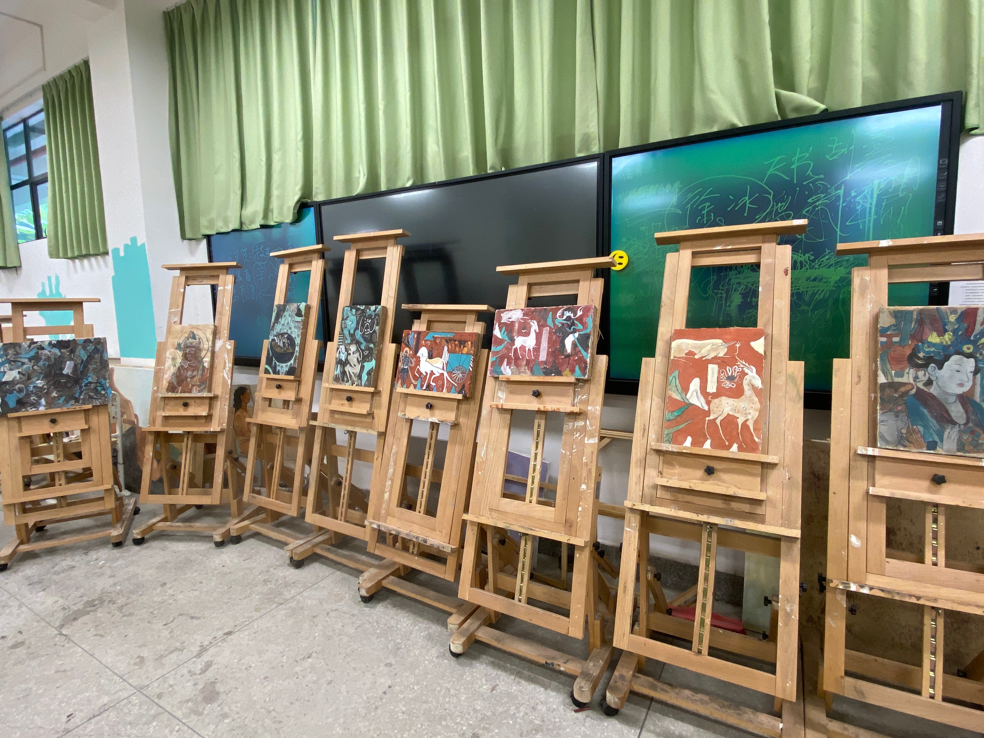 胡老师带着我们做地仗、模拟最真实的壁画体验,我们的作品也与原画同大,这都让我们更能深刻体会中国传统壁画绘画的语言表达。刚刚上手画的时候,我不太敢画,我们的画幅是最大的,但效果一直不强,导致我们小组出现明明应该是人多力量大却进度缓慢的问题。后来胡老师告诉我们254窟是北魏时期的,风格粗犷,可以大胆画…一直鼓励我们引导我们大胆的表现,最后我明白完成比完美更重要。在初次上色时,我采用水彩技法里的平涂法铺色与壁画原作有着较大差距,胡老师后来告诉我们中国画要以线造型,用线找型,通过练习,我也逐渐感受到了中国画画法的独特魅力。