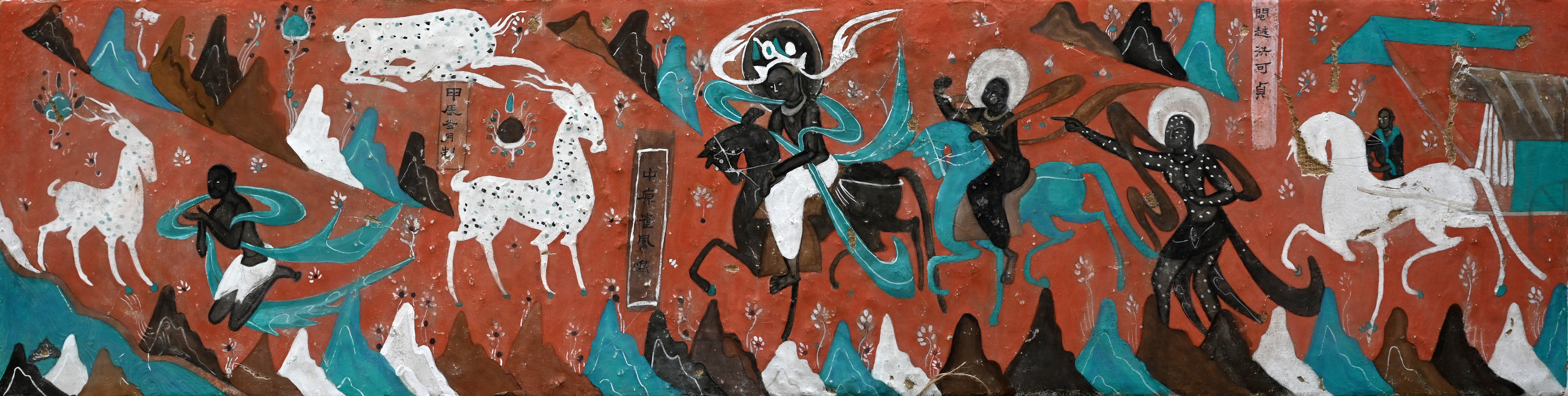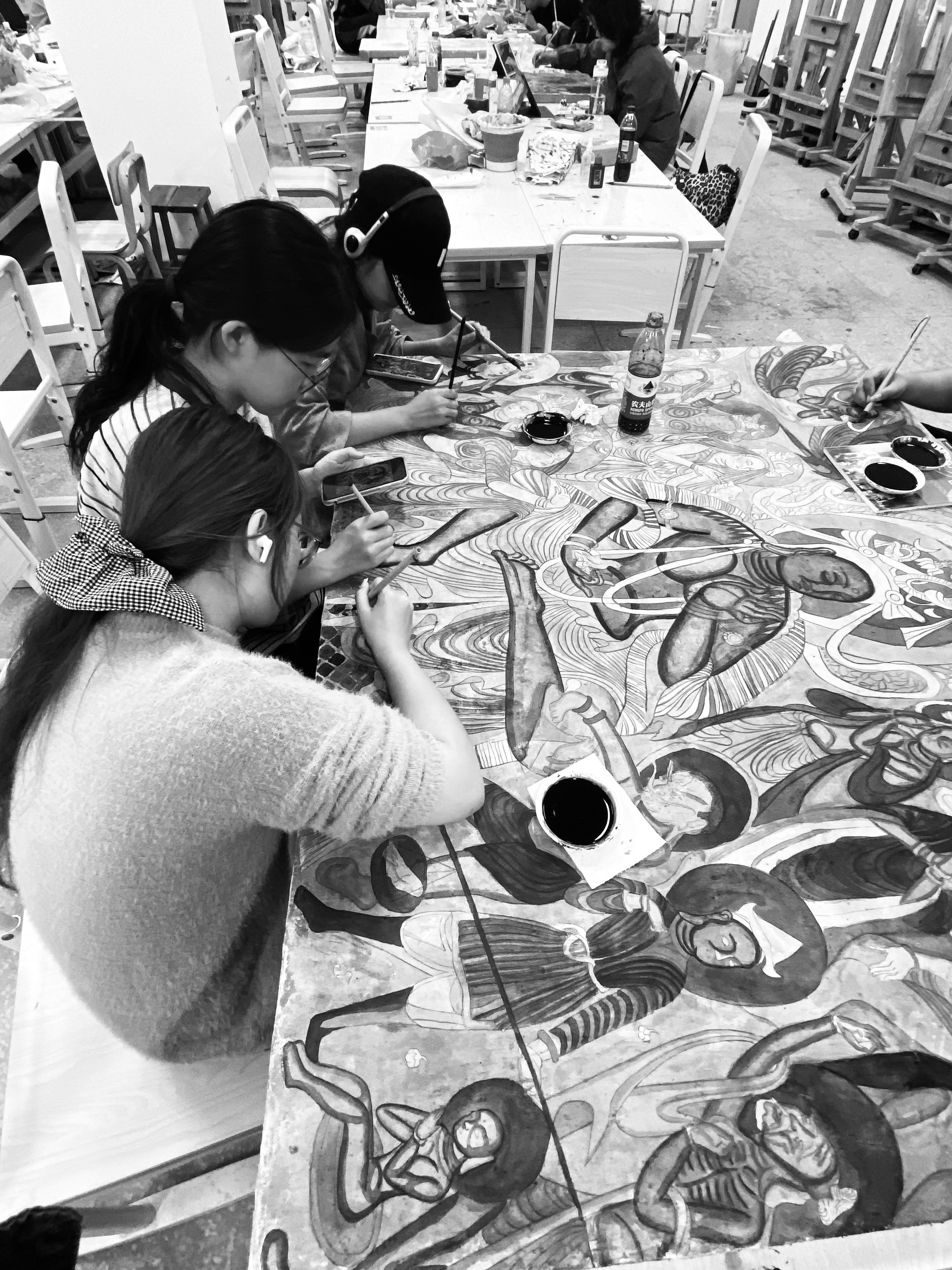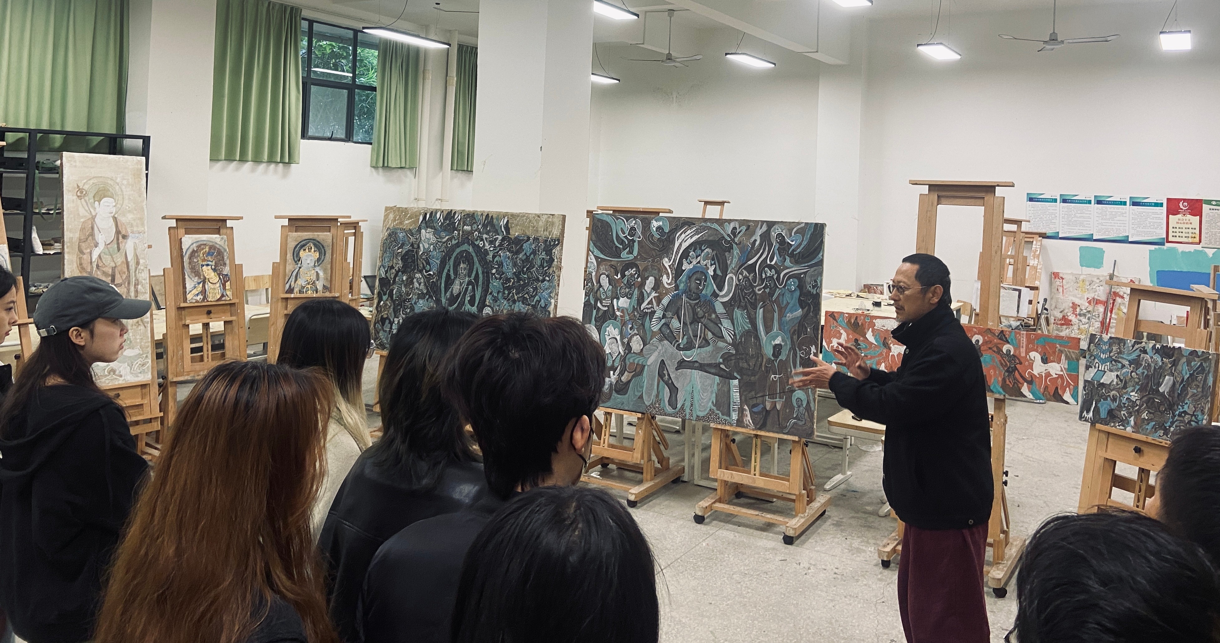 《中国传统壁画临摹》是面向美术学院学生的专业拓展课,以理论和实践相结合的方式,初步认识敦煌壁画的经典遗存。课程从莫高窟的历史背景、文化内涵和壁画故事文本的梳理,在理论上对敦煌壁画构建出一个立体的认识。要求学生绘制中严格按照传统壁画的绘制流程,体会古代画师对壁画工艺的尊重与严谨。建议学生按小组结合完成整铺壁画的临摹,感受壁画独特的图像叙事逻辑,也可个人选取局部进行现状临摹。临摹过程中体会矿物材料的特性、美感,并分析经过时间洗礼后的壁画色彩的承接关系等。鼓励来自不同专业的同学发挥自身艺术能动性,在实践中体会传统壁画与本专业绘画的异同,激发自身的创造性,为日后的创作提供更多的可能性。