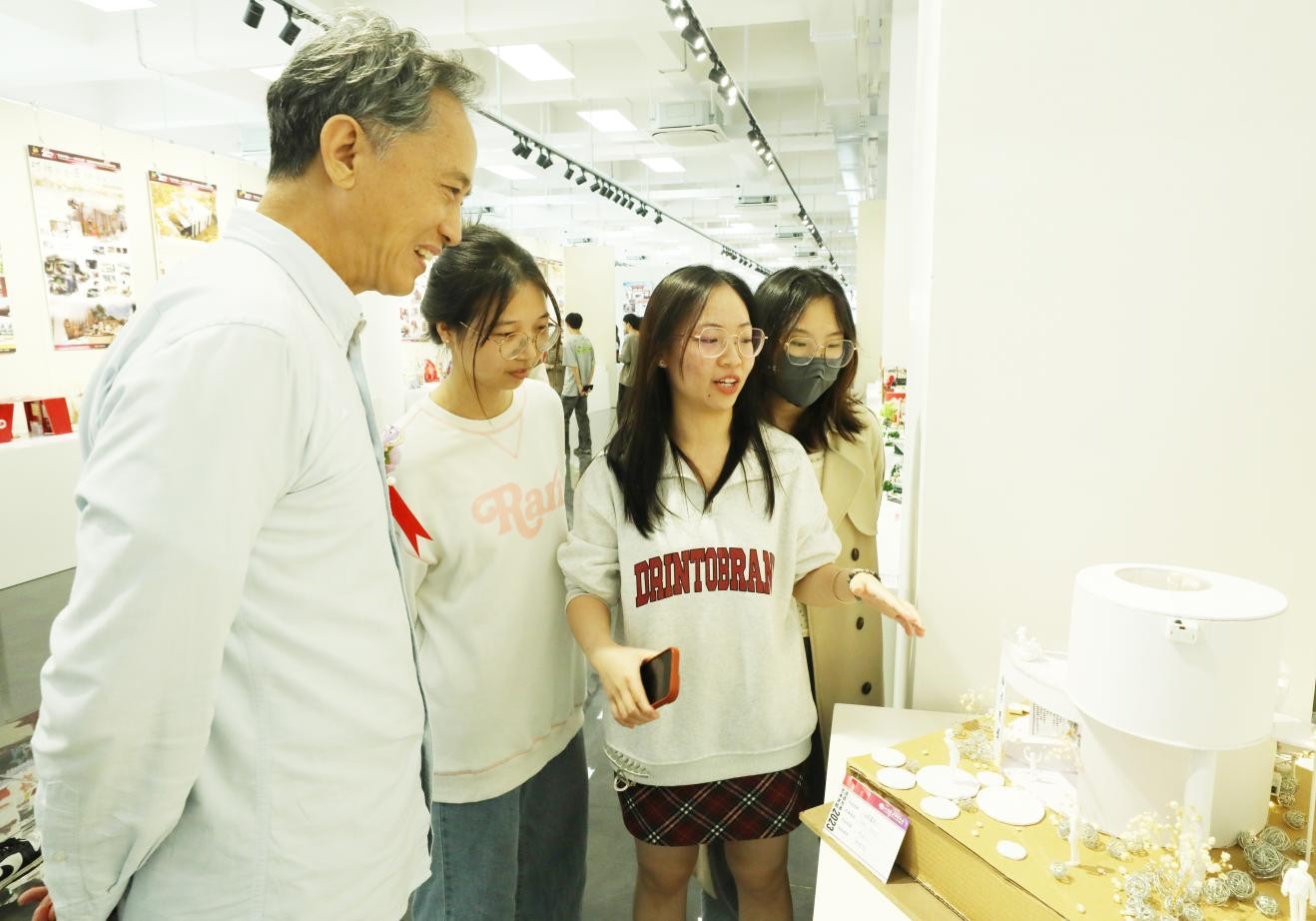 (北海艺术设计学院校长卢新华、建筑与环境艺术学院学生讲解作品)