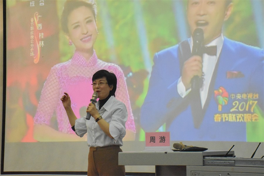 “她是个优秀的主持人,是我发现少有的人才”,周游教授如此评价邓璐。她为同学们播放邓璐的相关栏目,告诉大家多读书、多积累,技多不压身。而后周游教授向同学们介绍曾担任2017年春节联欢晚会的主持人、现任广西电视台主持人高枫,优秀主持人杨圳涛,播放了杨圳涛在《主播有新人》上的比赛片段。周游教授指出:“一路都要坚持,一路都要学习,等到我们真正绽放的,我们会谢谢自己,一直在努力。”她表示只有对播音这个行业热爱,才能持之以恒的完善自己,丰富自己的阅历,脚踏实地,努力奋斗,最终才能收获成功。