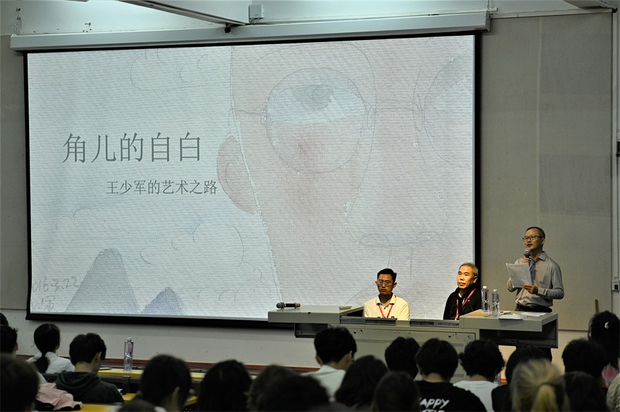 在讲座正式开始前,王少军教授播放了一段名为《角儿的诞生》的视频,通过水彩画作品以及独白,展现他个人的成长之路与经历,分享他在创作原创人物“角儿”过程的心得与感想,带领现场师生大致了解“角儿”这一艺术形象的创作过程,更加深刻地认识这一人物形象。