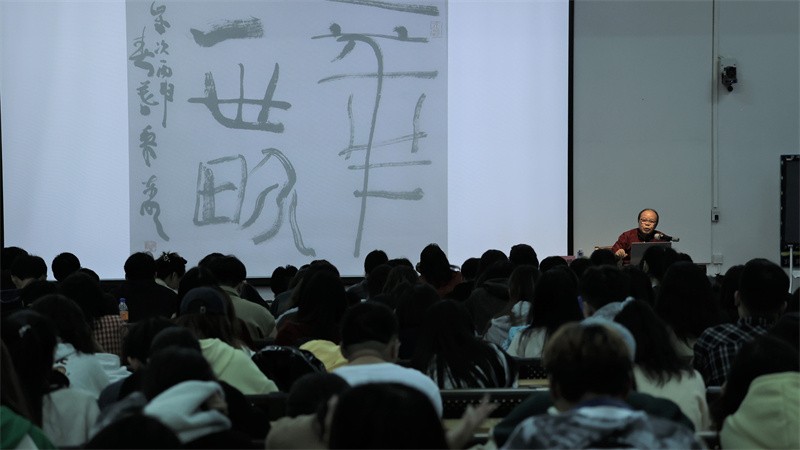 讲座过程中,黎东明教授结合个人书写经验与书法作品分享,为现场师生展示笔画姿态对惯性用笔的空间解构,以不同作品的不同线条为例,深入对笔画内在信息量的解读,展现气息的内聚呈现线条的丰富程度。他以线为基,将笔画走势与空间特征、笔画间距与空间节奏相互交映,对书法的独立性与内敛凝聚进行剖析。
