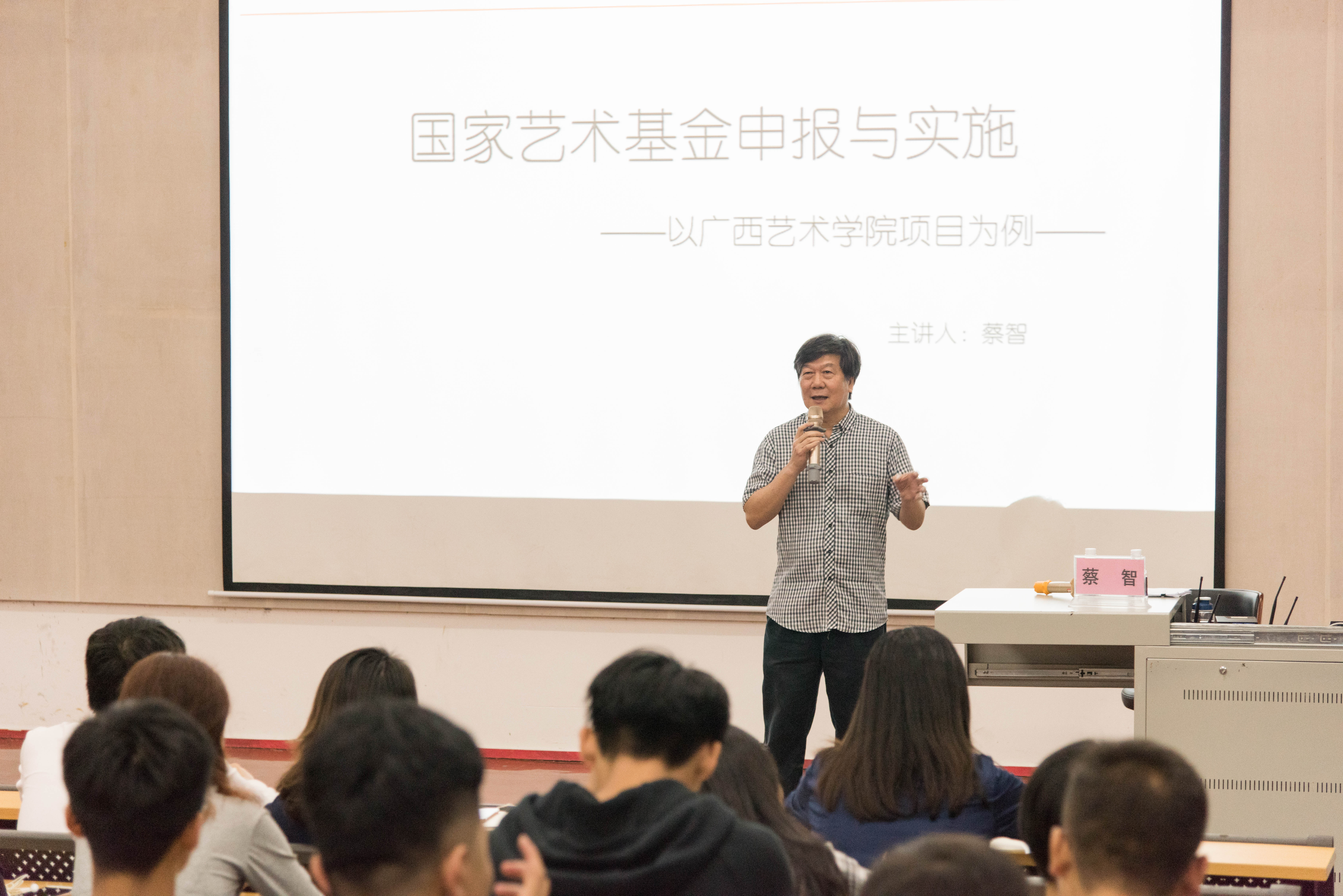 2019年11月16日晚上7:30分于我校西校区伦理楼107,广西艺术学院教授蔡智为我校师生带来一场题为《国家艺术基金申报与实施--以广西艺术学院项目为例》的精彩讲座。现场座无虚席,本次讲座由胡胜副校长主持。