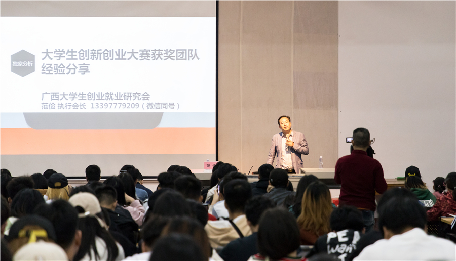 2019年12月1日晚8:00于西校区伦理楼107,广西大学生创业就业研究会范俭会长为我校师生带来一场题为《大学生创新创业大赛获奖团队经验分享》的精彩讲座,现场座无虚席。本次讲座由王斌副校长主持。