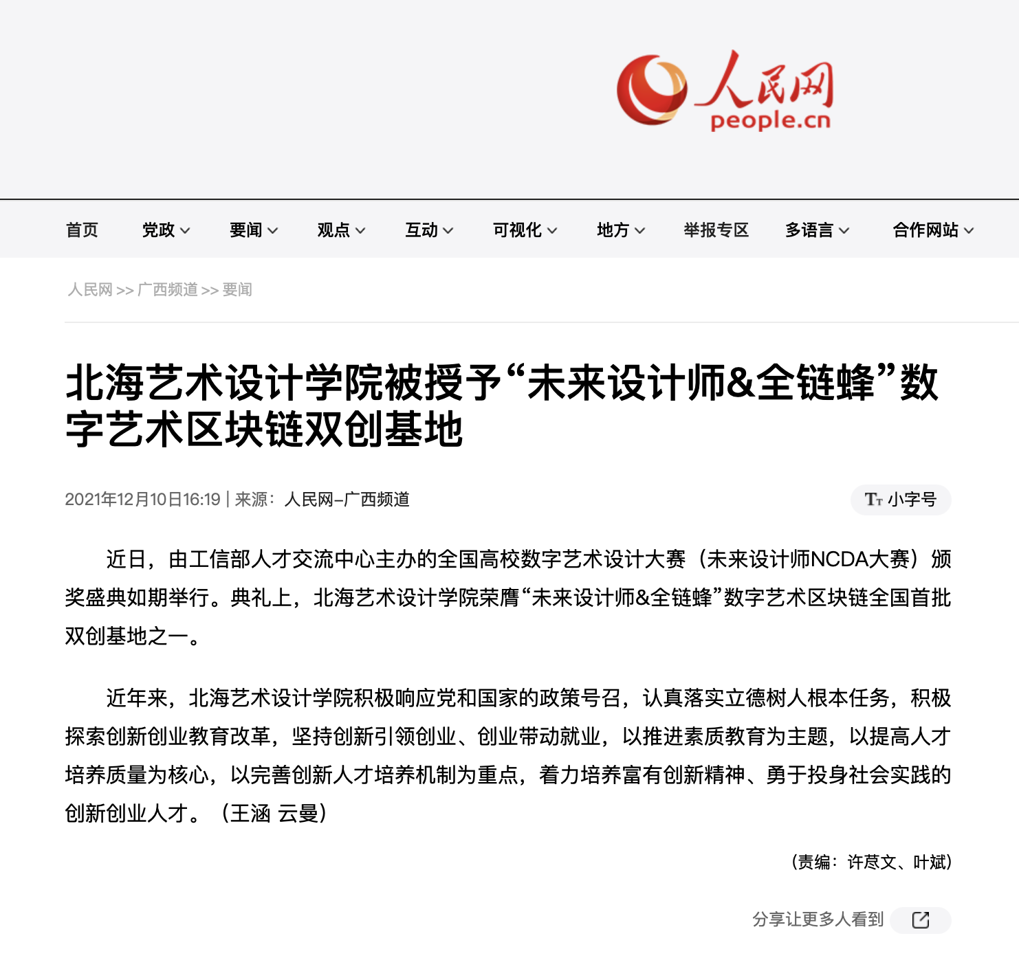 人民网:喜报||我校被授予“未来设计师&全链蜂” 数字艺术区块链双创基地
