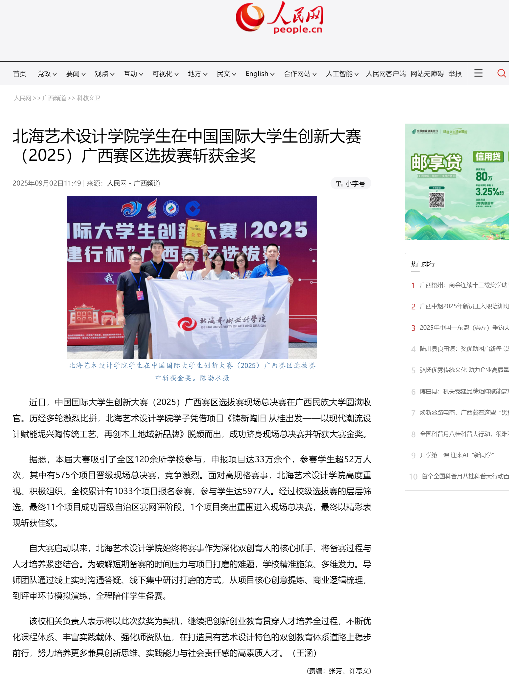 人民网:北海艺术设计学院学生在中国国际大学生创新大赛(2025)广西赛区选拔赛斩获金奖