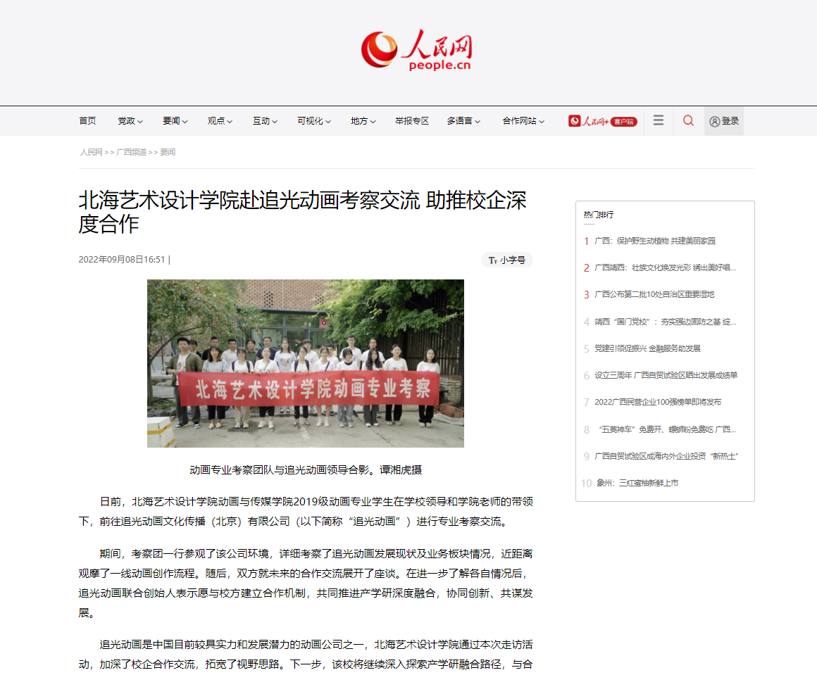 人民网:北海艺术设计学院赴追光动画考察交流 助推校企深度合作