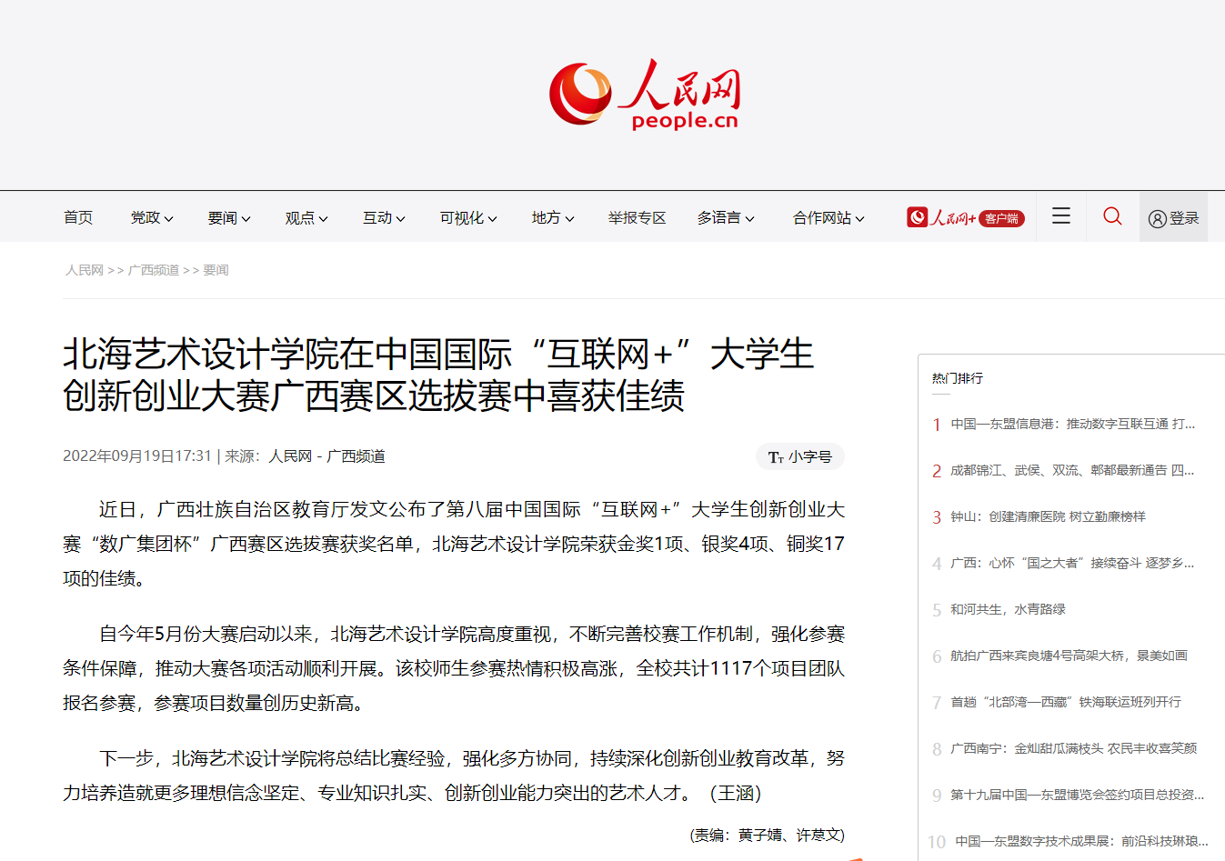 人民网:北海艺术设计学院在中国国际“互联网+”大学生创新创业大赛广西赛区选拔赛中喜获佳绩