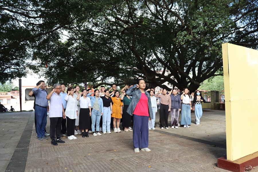 现场授课结束后,全体教师参观了涠洲岛国防教育馆,馆内以图片和文字的形式展示了涠洲军民武装起义、艰苦抗战以及解放涠洲岛战役的光辉历史,加深了教师们对涠洲岛革命斗争史的进一步了解。随后,在革命烈士纪念碑前深切缅怀革命先烈、重温入党誓词、重走红色之路,打造了边走边看、边讲边议的沉浸式思政教育方式,以最直接的、最有效、最管用的感官联系,结合教学实际与亲身感悟,有效地将涠洲岛红色文化、民族文化、军事文化深度融入思政课教学中,潜移默化地用好“活教材”、讲透“思政课”,为教师们更好地增强大学生思政课教育教学成效提供了参考。