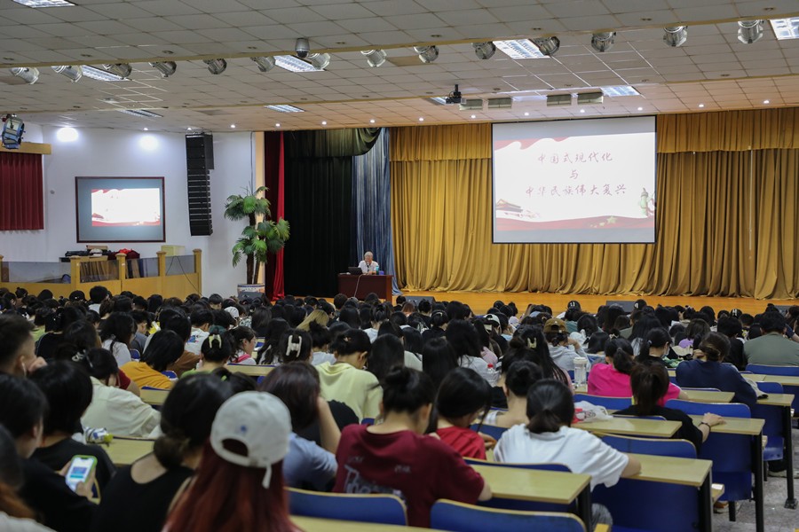 课上,马克思主义学院院长姜献生教授、韦邕青老师分别从中华民族伟大复兴的中国梦、中国式现代化发展之路、以中国式现代化推动中华民族伟大复兴、中国式现代化进程中的青年选择四个方面生动诠释了中国式现代化与中华民族伟大复兴的深刻意蕴和时代意义。据了解,此次上课教室里“人满为患”,甚至还有学生直接搬着凳子旁听, 深受在场师生的喜欢和热爱。