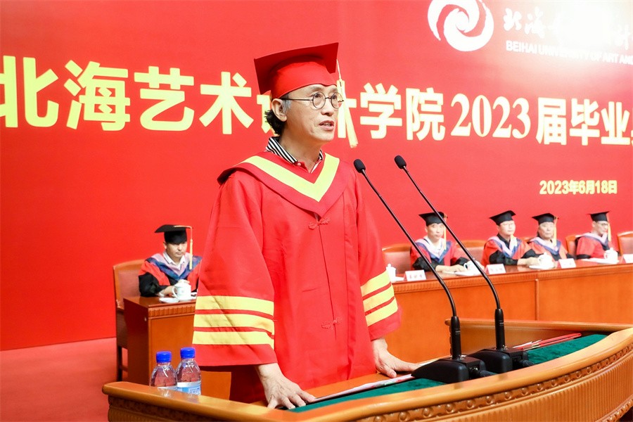 校长卢新华以《不改初心 矢志奉献》为题,为即将离开校园,扬起人生理想新风帆,走向新生活的2023届毕业生致以最热烈的祝贺和最美好的祝福。他指出,四年来,广大毕业生在学校“北海北京双城育人,名校名师双名引领”下追逐理想,不断成长;在“道德为本、艺术求精”的办学理念洗礼下,启迪思想灵魂,升华人格境界,在北艺校园里留下了难以忘怀的青春故事和奋发向上的励志事迹。在毕业生们开启人生新旅程之际,卢新华对2023届毕业生提出三点希望:一是要坚定理想信念,担当使命,矢志奉献国家和人民。既要有远大的理想信念、鸿鹄之志、家国情怀,更要有使命担当,把个人艺术追求和理想融入国家前途、民族命运、社会大义人民福祉,做有情怀、有大义、有担当的新时代青年;二是要勇于挑战自我,不忘初心,做德艺双馨优秀人才。敢于面对挑战,勇于抓住机遇,以青年人的锐气站在时代前列,勇毅前行,坚定信心,勇立时代潮头,争做时代先锋,同时要牢记“道德”校训,明道立德,不忘初心,以德铸魂,磨砻淬砺;三是要扎根生活沃土,认真做事,不负时代赋予的使命。以兢兢业业、一丝不苟的工作态度,精益求精、尽善尽美的精神追求认真做事,真抓实干、精益求精、开拓进取,关心人民对美好生活的向往和需求,用高尚的文化艺术新风引领社会风尚,做有信仰、有情怀、有担当的文艺工作者。卢新华寄语广大毕业生展翅飞翔、乘风破浪,勇做走在时代前列的奋进者、开拓者、奉献者,成为祖国文化艺术和经济建设发展的栋梁之材。他还表示,母校北艺将永远是毕业生们坚强的后盾、温暖的港湾,希望大家梦想成真,事业有成,捷报频传。