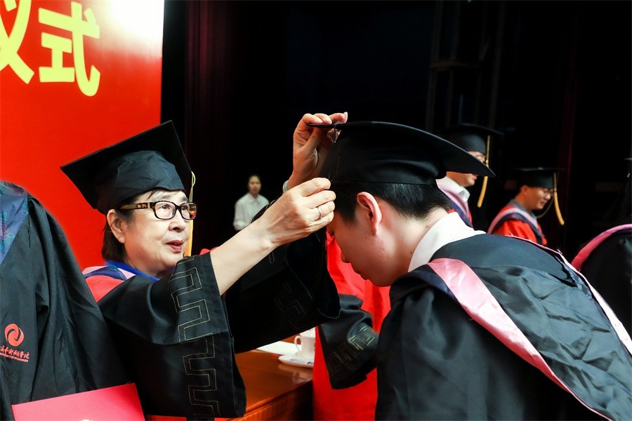 典礼上,学校学位评定委员会委员为毕业生代表颁发毕业证书和学位证书并一一拨穗正冠,合影留念。师长声声祝福温情入耳,眼含欣慰扶手相送;学子毕业礼成,意气风发,振翅高飞。