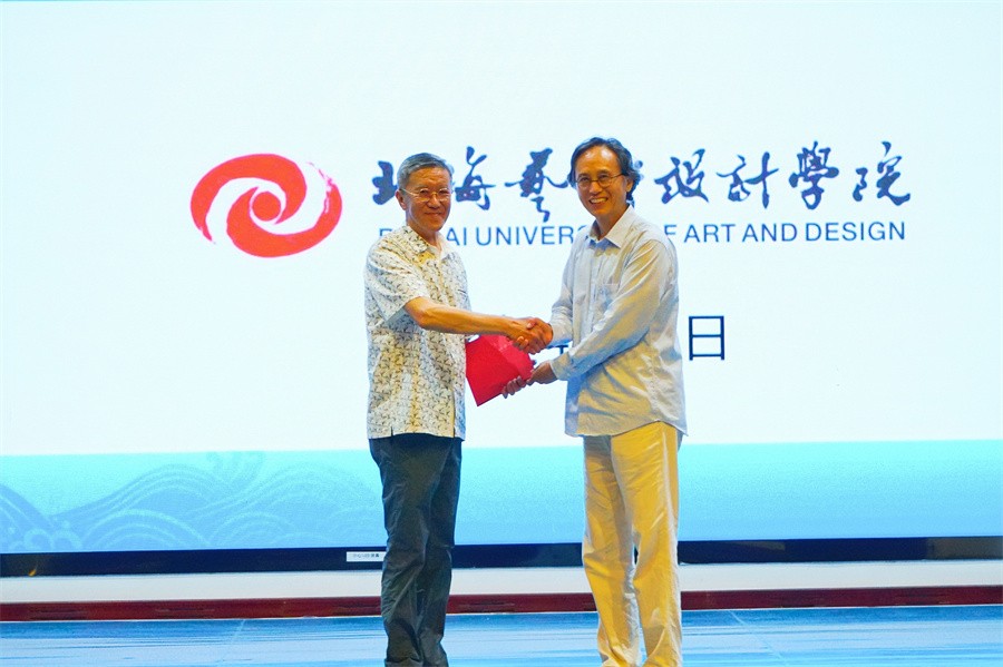 随后魏小明教授以被誉为北海名片“潮”雕创作过程和自身艺术成长、心路历程,为我校师生带来了一场题为《艺·海·潮》的精彩讲座。