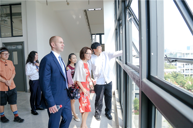 会议结束后,双方就中英文化教育特色、双方办学理念进行了深入的探讨和交流,气氛融洽,讨论热烈。在学校领导的陪同下,英国德比大学校领导一行人参观了我校校园环境,并走入课堂深入工作室了解教学情况。