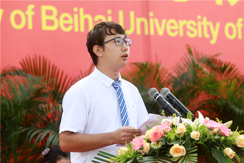北海市委常委、宣传部部长、副市长黄江在典礼上致辞说,北海中国最美的海滨城市之一,是中国西南地区同时拥有深水海港、全天候机场、高铁、高速公路的城市,北海是古代“海上丝绸之路”的重要始发港,国家历史文化名城。北海市面临的北部湾有丰富的海洋资源,海洋生态环境良好,这里有热情好客的北海人民、有回味无穷的海鲜特产、有独具特色的地方文化。她指出,北海艺术设计学院是一个容纳上万人的校园,到处洋溢着朝气蓬勃,青春活力,希望同学们在新的学习环境中,要时刻牢记时代赋予大家的崇高使命,不断提升自身能力,努力练就扎实本领,脚踏实地、勤奋拼搏,走好大学之路,人生之路,将来成为对国家、社会有贡献的人才。