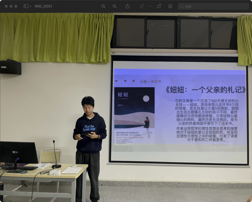 美术学院于2021年11月25日左右,各班分别举办“生命教育” 主题班会。读书使同学们能够在一个文明健康的精神状态下生活,大家共同创造一个文明的校园环境,让所有学生都可以充实自己的大学生活。本次班会因为有这几位同学们的积极参与,分享自己喜爱的书籍,有老师介绍对专业有帮助的书籍和纪录片才能圆满的举行,虽然本次班会不可能完完全全改变同学们的阅读规范,但是我相信这次班会或多或少会对同学们对于读书的意义有新的了解、也会选择更加有益的课余活动。所以我认为这次班会时很有必要的,再也同学们和老师的积极配合下圆满的完成了。(张洁妮 摄)