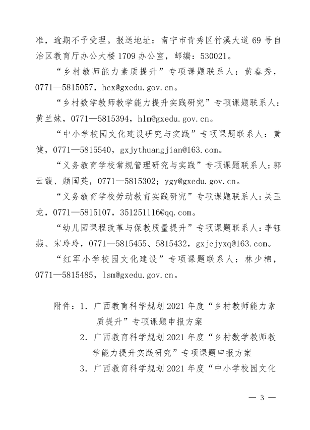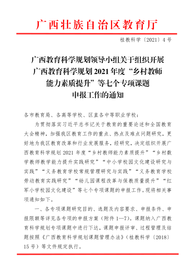 广西教育科学规划领导小组关于组织开展广西教育科学规划2021年度“乡村教师能力素质提升“等七个专项课题申报工作的通知