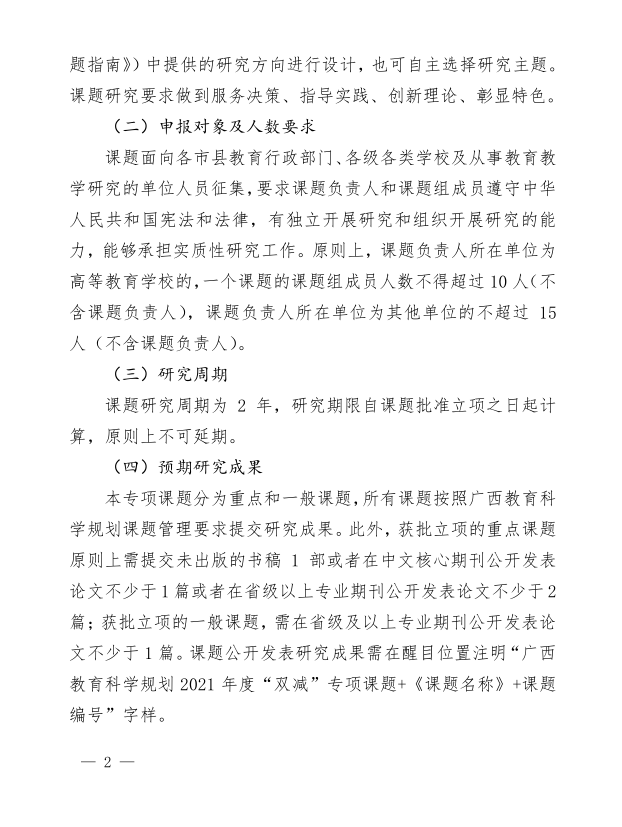 广西教育科学规划领导小组关于组织开展广西教育科学规划2021年度“双减”专项课题申报工作的通知