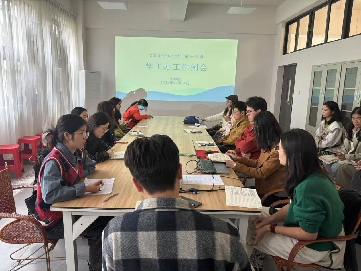 为进一步加强辅导员队伍建设,夯实学生工作基础,切实提升工作成效,我院于11月27日在南校区体育馆105会议室召开文学院学工办工作例会。学院党支部书记岳莹,学工副院长裴景旺、学工办主任陈文斌、学工办副主任韦帆、各年级辅导员以及各班级辅导员参与本次会议,会议由学工办主任陈文斌主持。