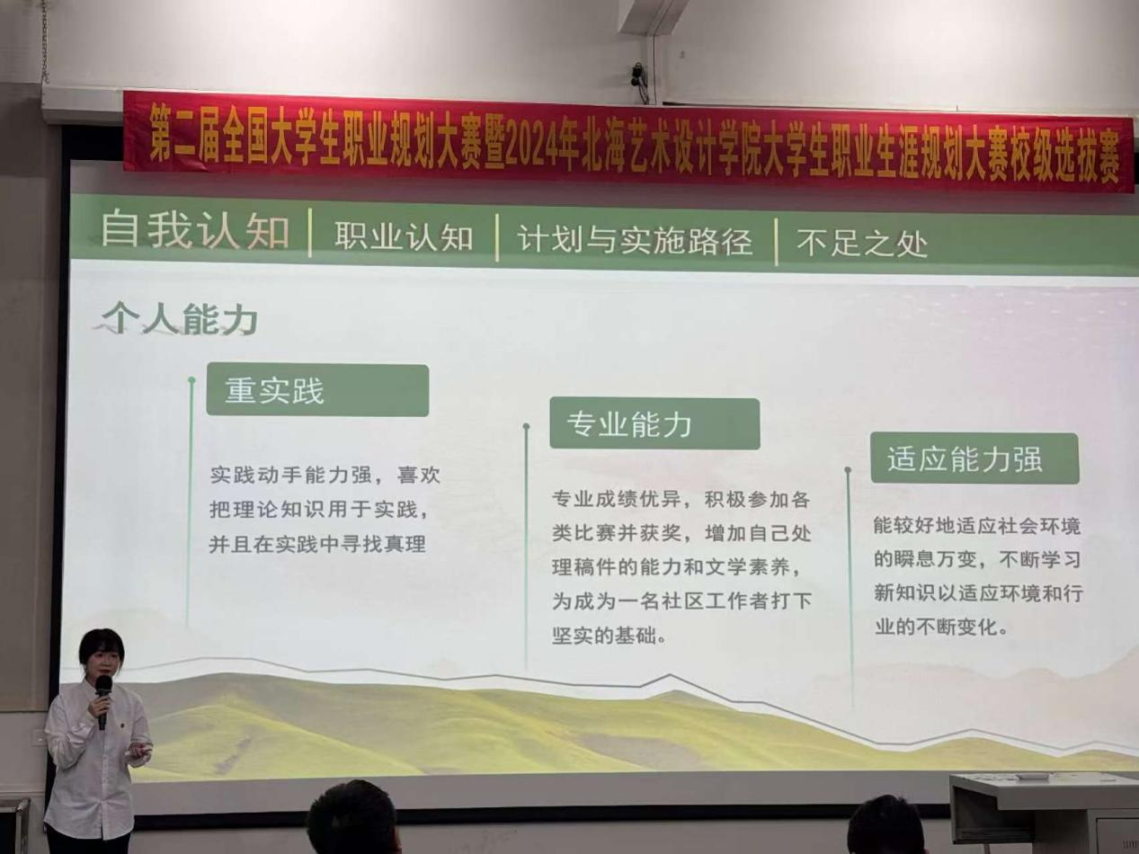 2024年12月20日,第二届全国大学生职业规划大赛暨2024年北海艺术设计学院大学生职业规划大赛校级选拔赛决赛在北海艺术设计学院西校区G-107室圆满落幕。经过复赛、决赛的激烈角逐,我院2023级汉语言文学专业2303班李敏、2304班李俊鹏分别荣获一等奖、二等奖的好成绩。