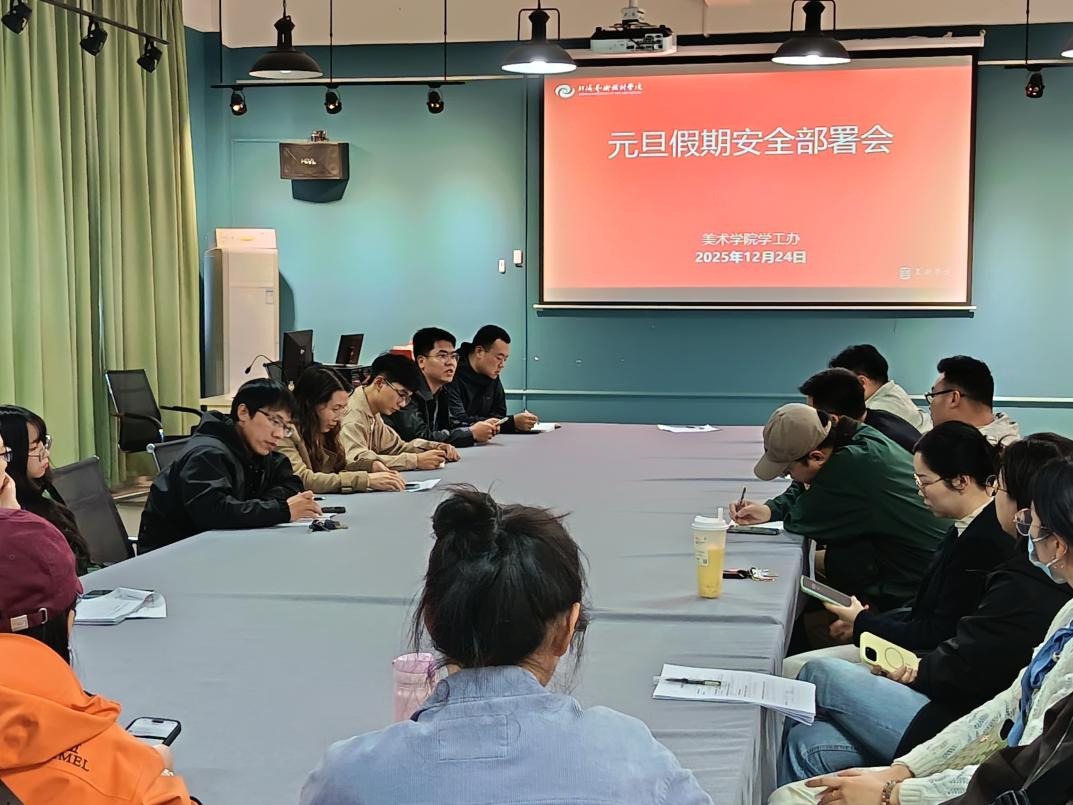 为确保全院师生度过一个安全、祥和的元旦假期,12月24日下午,美术学院学工办在艺术楼313召开专题工作部署会,学工人员及全体23-25级班级辅导参会,会议鲁明阳副书记和林昌华副院长共同主持,对假期各项安全工作进行了全面安排。
