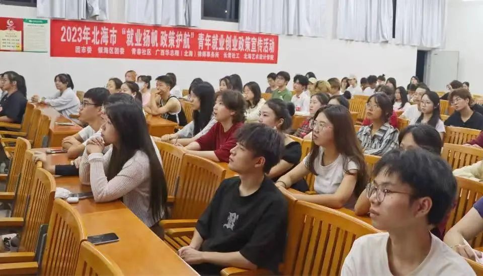 10月26日19:30,由团市委、银海区团委、青春社区、广西华志翔(北海)律师事务所、长青社区、北海艺术设计学院承办的2023年北海市“就业扬航,政策护航”青年就业创业政策宣讲活动在我校功德楼111开展。