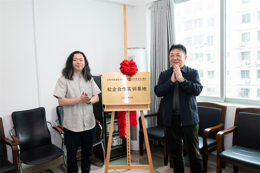 3月28日上午,我校与北海市融媒体中心校媒合作签约暨“实践教学基地”揭牌仪式在北海市融媒体中心举行。北海市融媒体中心党委书记、主任李军,副主任吕峰,总编办主任许毅本,人力资源部主任梁晓宁,我校常务副校长胡胜,美术学院执行院长龚为、动画与传媒学院院长孙永辉等领导及学生代表出席签约仪式。