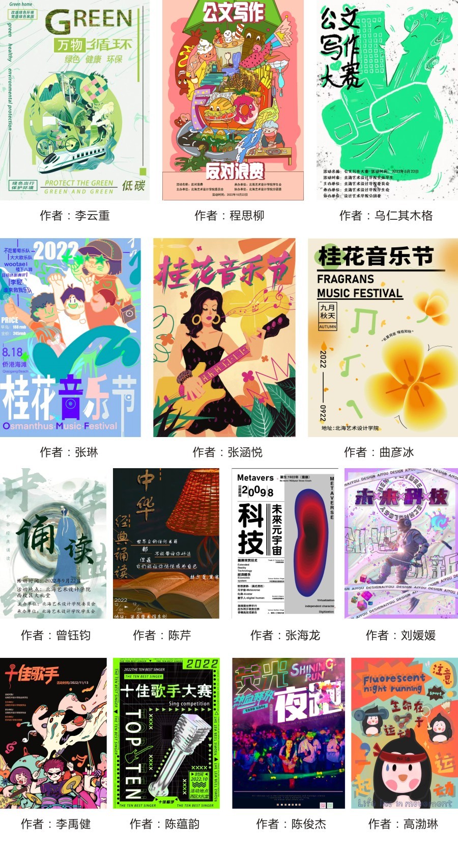 比赛选题共分为中华经典诵读、公文写作大赛、荧光夜跑、科技创未来、十佳歌手、桂花音乐节,自2022年9月10日启动以来,得到了积极反响,征集活动历时22天,共收到百余幅作品。于9月22日在行政楼118举行评审,由设计艺术学院分团委老师和专业课老师组成的评委团从作品的艺术性、技术性、美观性与识别性四个角度对作品进行综合考量,最终有24幅获奖作品从中脱颖而出。