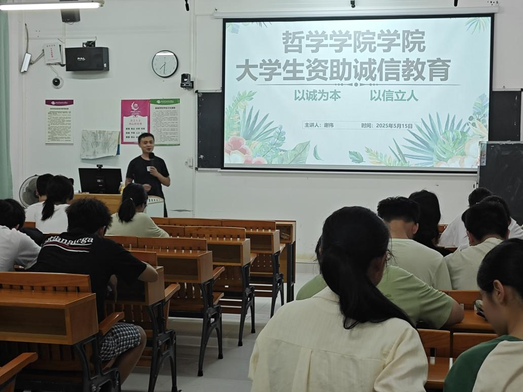 活动伊始,主持人梁兵老师简明扼要地介绍了活动流程,为整场活动拉开序幕。随后,哲学学院党支部、团总支书记谢伟以 “以诚为本,以信立人”为题,为同学们带来了一堂意义深远的诚信教育课。谢伟书记深入细致地讲解了国家奖助学金、优秀学生奖学金、生源地助学贷款、勤工助学、学校困难补贴、征兵入伍补偿等资助项目的申请条件,同时围绕国家助学贷款获贷学生的征信和还款知识展开详细教育。他号召全体同学积极行动起来,共同营造诚信为荣、感恩祖国的浓厚校园文化氛围。此外,谢伟书记着重提醒同学们,要合理使用奖助学金,既可以将其作为生活补贴,缓解家庭经济压力,也可以用于社会实践中,参与对提升自身综合素养有益的社会活动。他特别强调,同学们应崇尚节俭,避免在现有开支基础上进行不必要的消费升级,杜绝攀比式高消费行为。