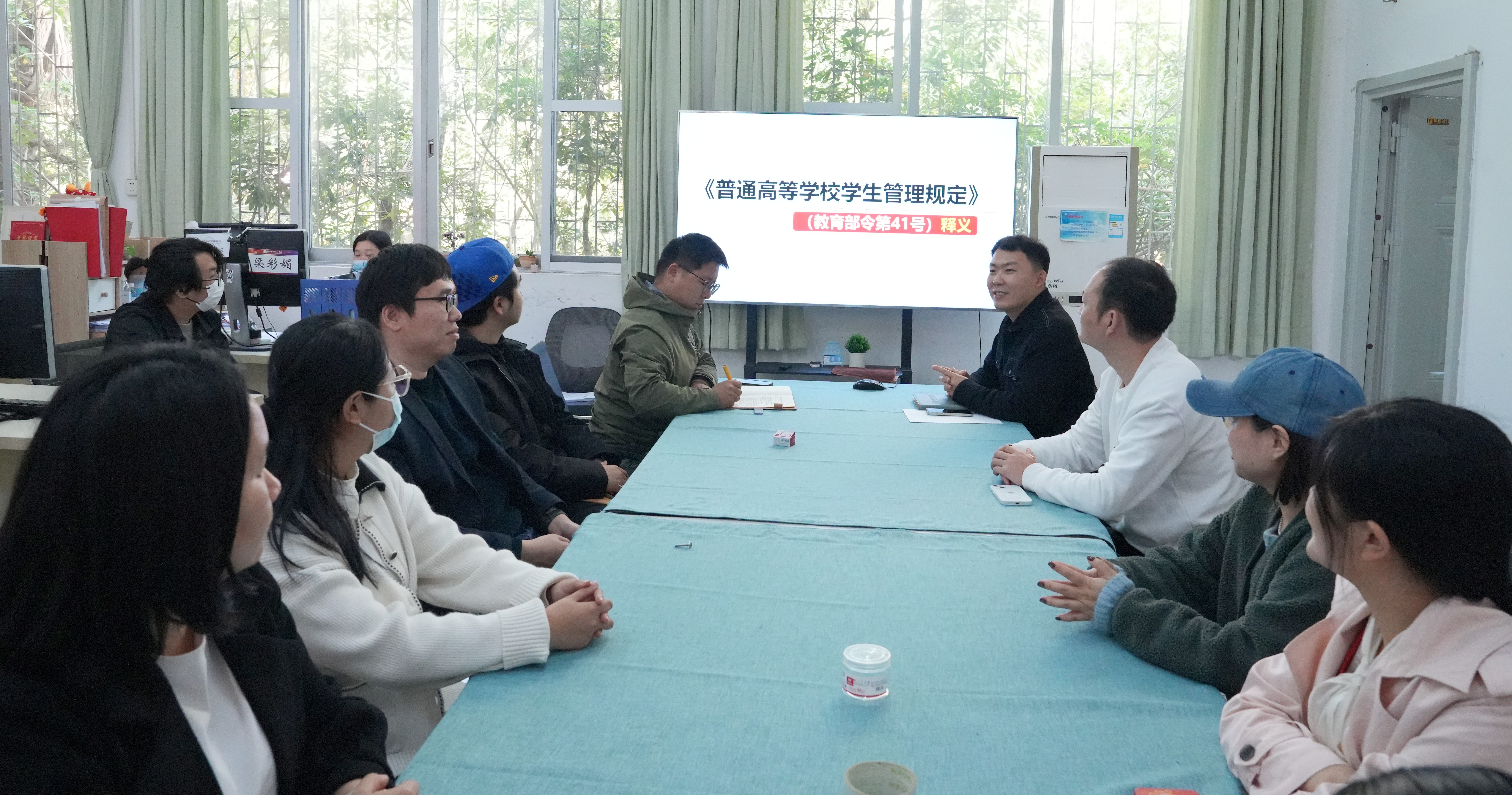 学院学工办精心准备释义与解读资料,助力辅导员深度领会文件精髓,确保在日常管理中精准施策、有章可循。各年级辅导员采用专题会议形式、分多个时间段精心组织学习,确保无一人遗漏,有效提升了辅导员对规定的知晓率与参与度。在学习过程中,辅导员们认真聆听、热烈讨论,就如何将规定更好地融入日常管理工作各抒己见,形成了良好的学习氛围。