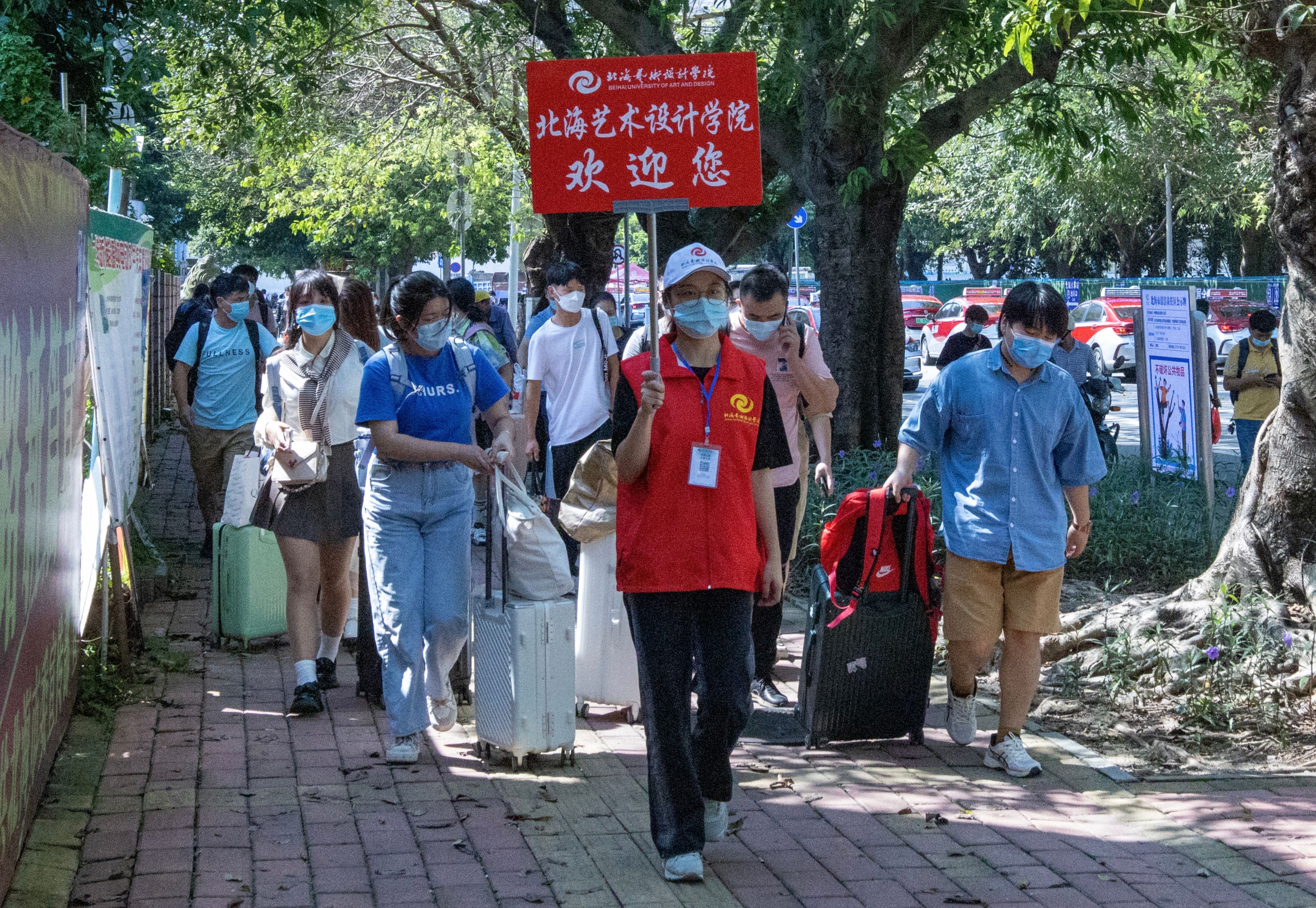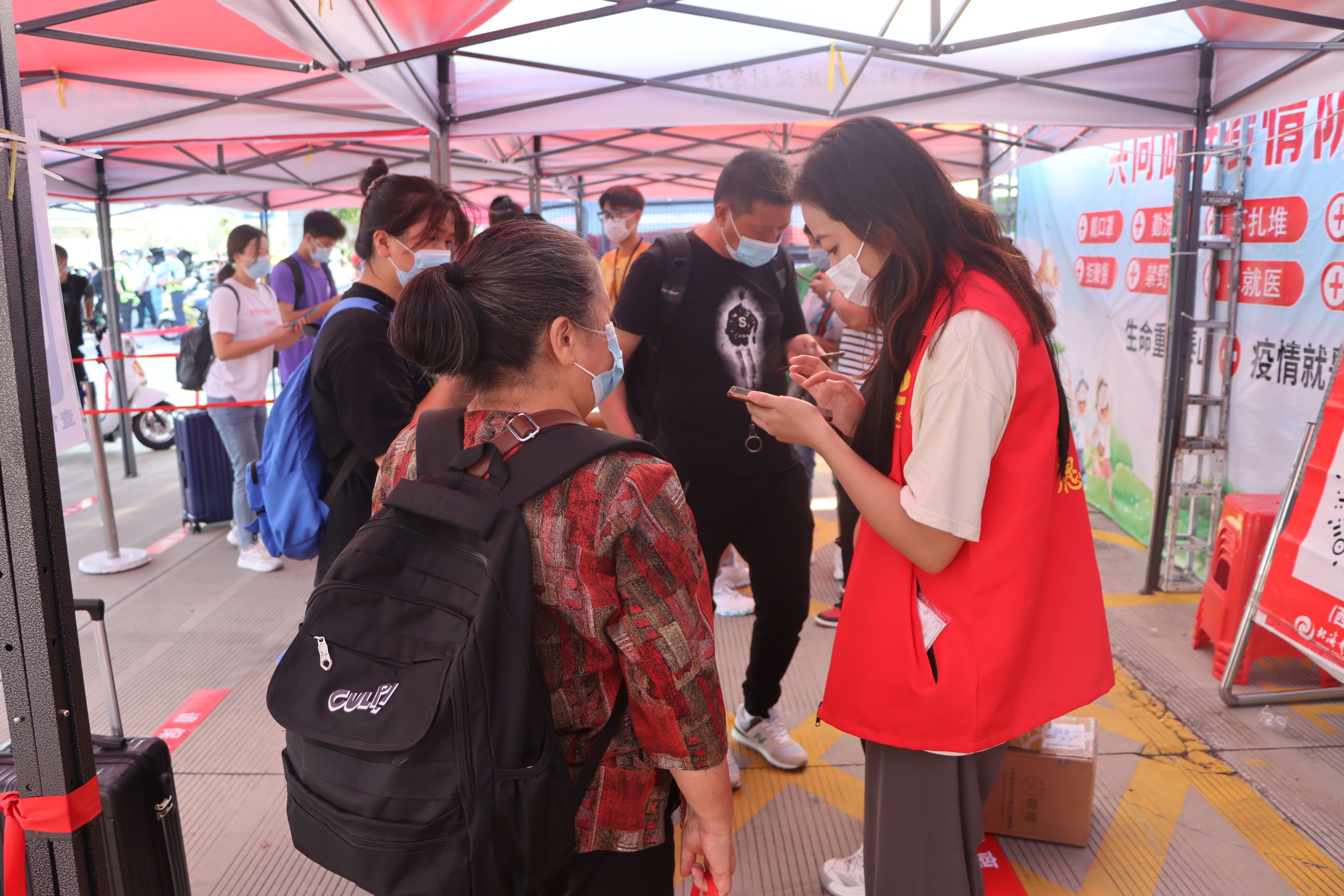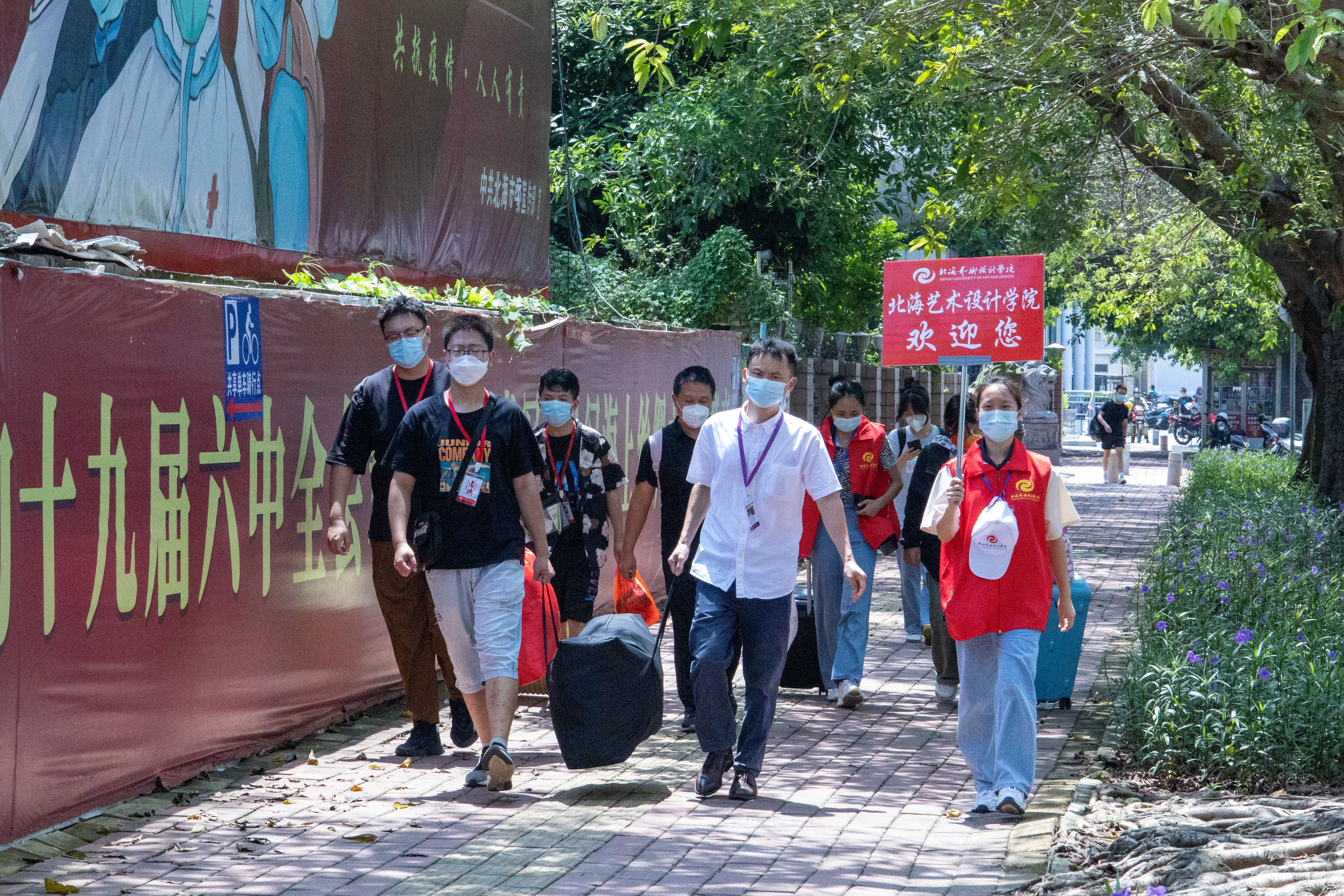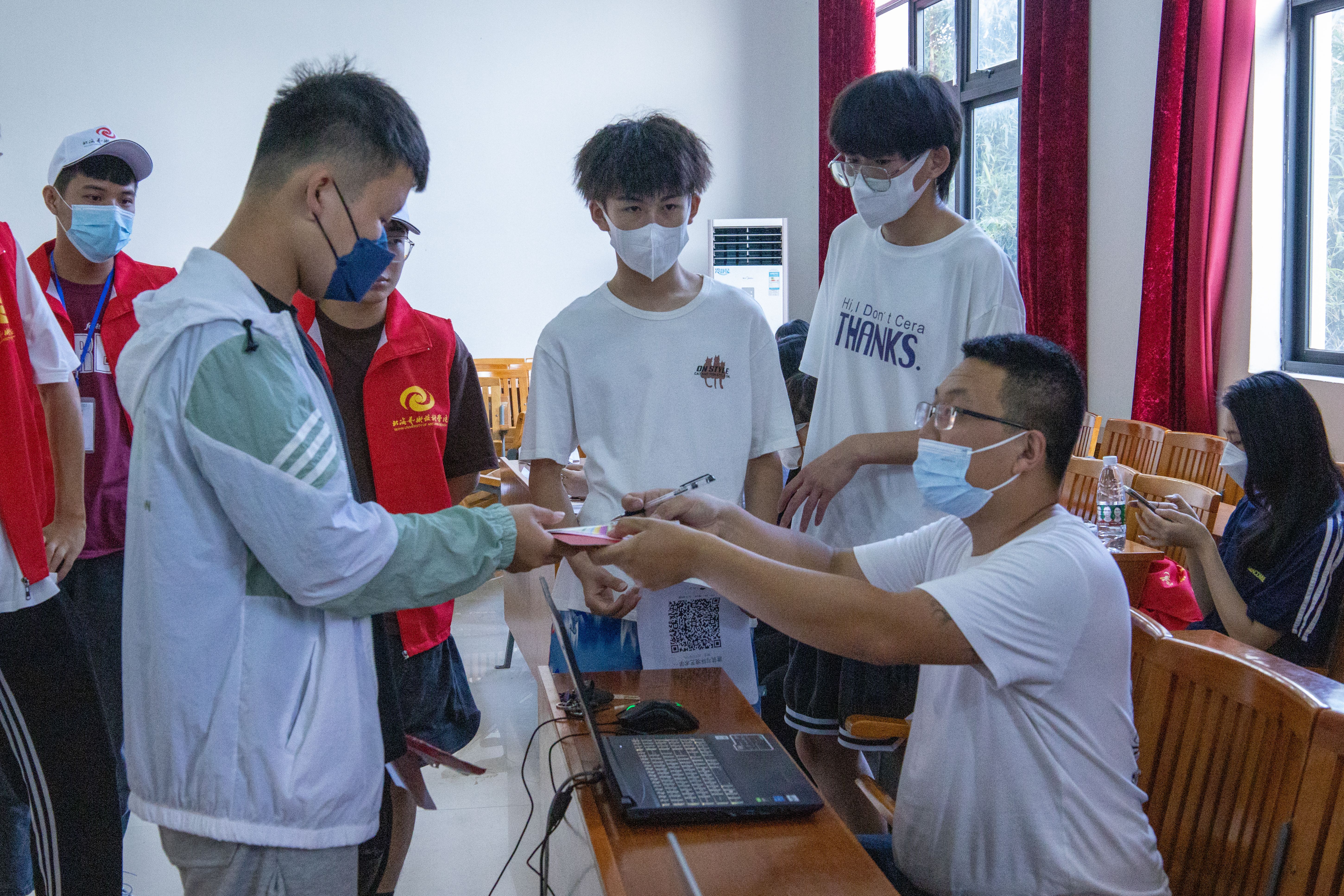 为确保新生入学工作的顺利开展,学校在北海火车站、北海福成机场均安排了迎新车辆。新生到达学校后,有序排队测量体温、查验录取通知书、广西健康码、通信大数据行程卡,以及对其行李进行消杀,方可入校。