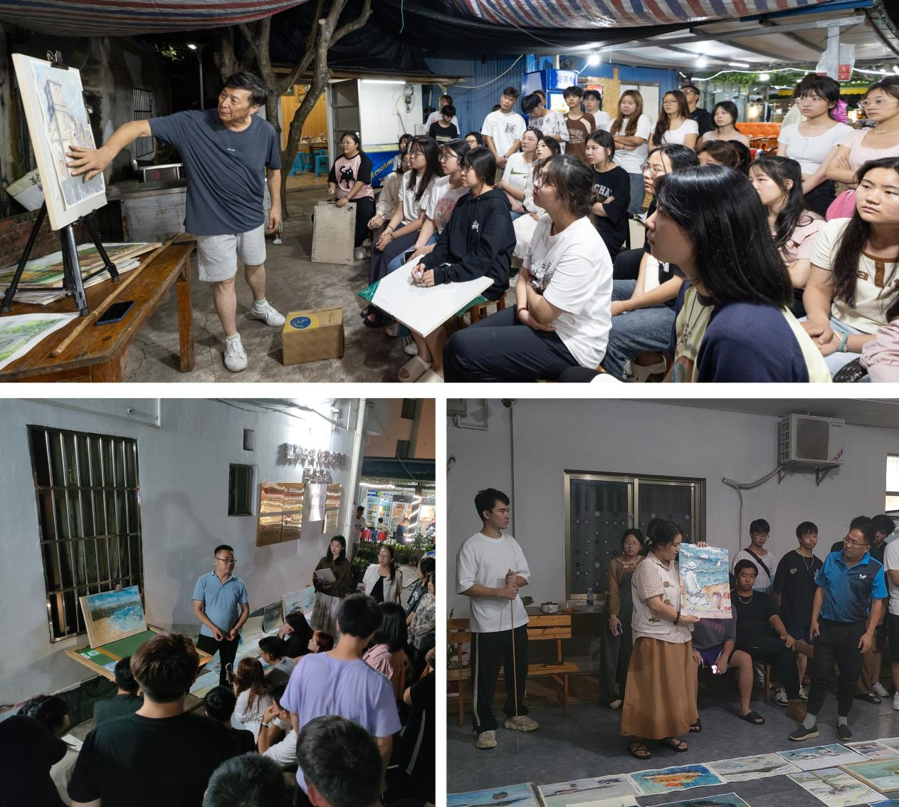 晚间的点评环节也同样精彩。教师采用了多样化的教学方法进行点评,如案例分析、指导等方法,不只分析了学生作品的优缺点,还提供了实用的取景、调色和笔触技巧,极大地提升了学生的写生水平。同时,通过讨论方式激发学生发挥主动性,促进了批判性思维的发展。在教师的指导下,学生作品水平、艺术修养都得以明显提高。