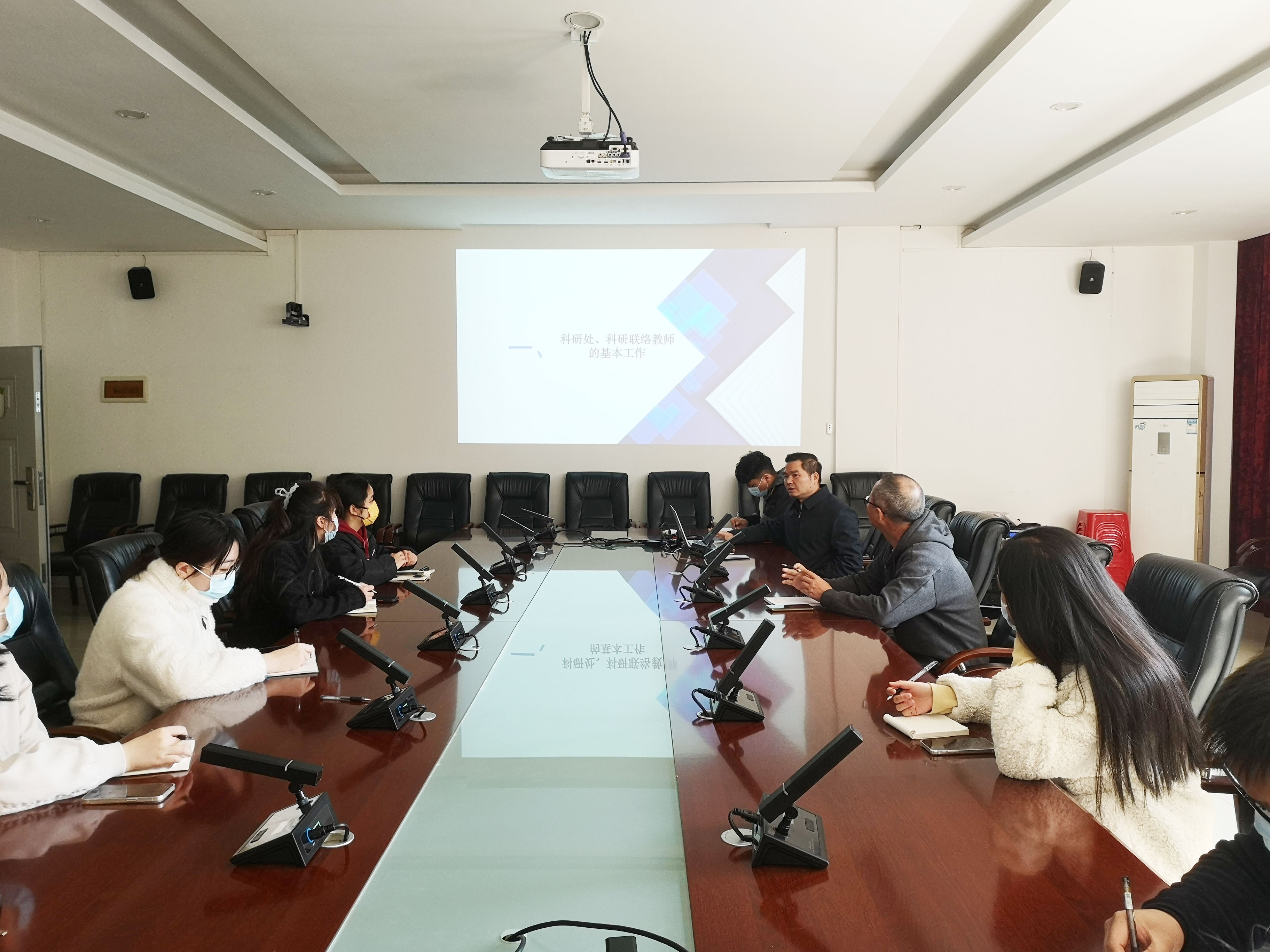 2022年12月13日,在西校区行政楼212召开了“2022年北海艺术设计学院科研工作总结会议”,参会人员有副校长兼科研处处长王斌,各二级学院、学校各部门科研联络教师,以及科研处部门成员。