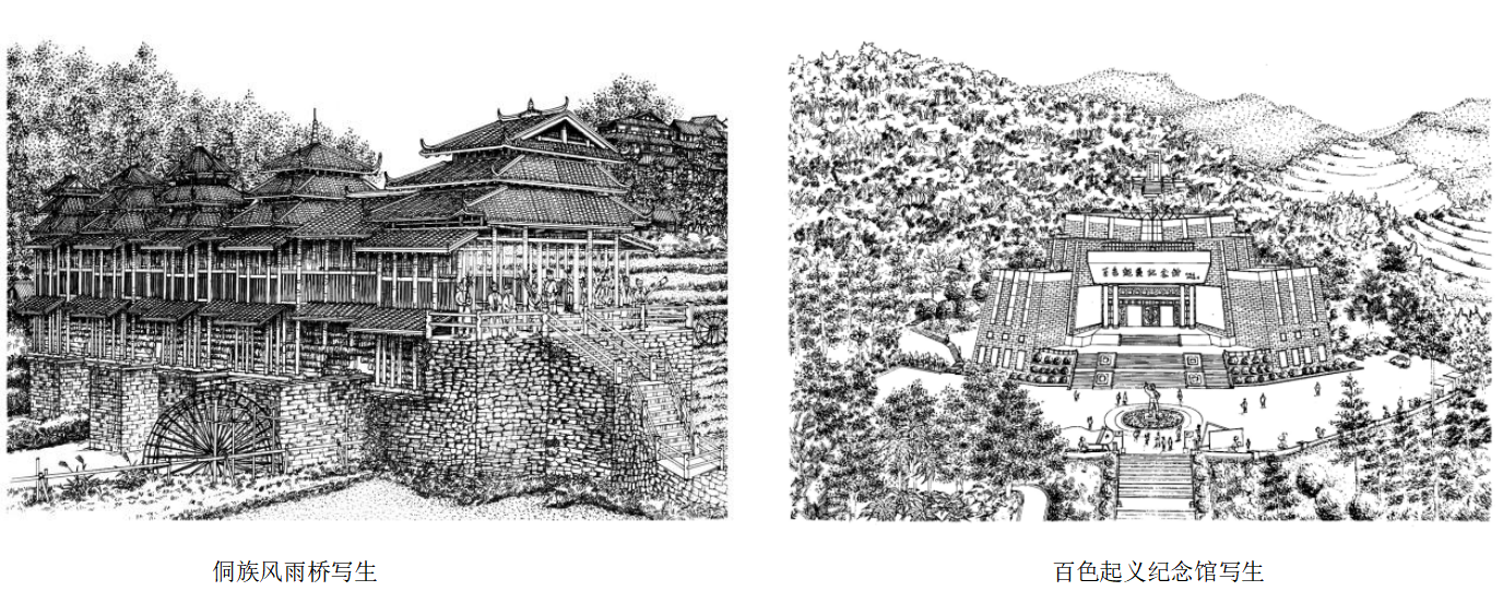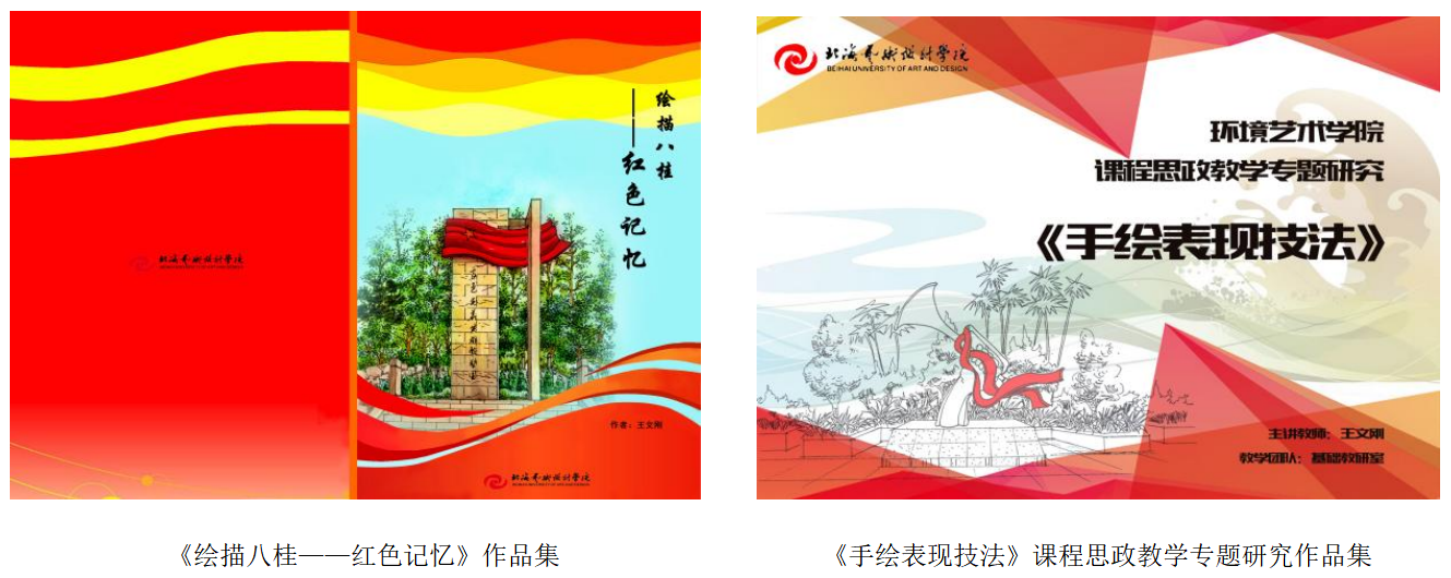 2022年王文刚老师基于中青年教师科研基础能力提升项目《红色旅游背景下北海市红色文化景观与城市内涵建设研究》,完成了《绘描八桂——红色记忆》和《手绘表现技法》课程思政教学专题研究作品集。