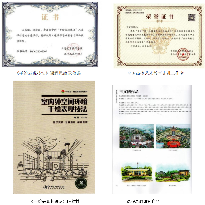 作为环境艺术设计专业《手绘表现技法》课程负责人,王文刚老师积极开展《手绘表现技法》课程教学研究,2019年主编出版教材《室内外空间环境手绘表现技法》,2022年主持《手绘表现技法》校级本科专业核心课程建设项目。同时,《手绘表现技法》课程被评为2022年课程思政示范课,授课教师入选课程思政教学名师和教学团队。《手绘表现技法》课程目前还被建成为北海艺术设计学院网络教学平台网络线上课程,使教学形式多样,极大地丰富了线上教学资源,促进环境艺术设计专业教育教学质量。更加鼓舞人心的是,《手绘表现技法》课程获批2022年校级一流本科课程培育项目。