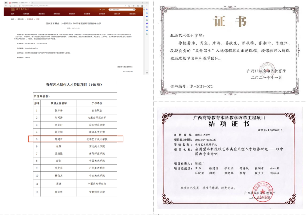 陈建江老师的科研不仅仅是艺术创作这类实践研究,还有教学和其他人文社科类。近年来主持和参加的各级各类课题/项目共计25项,其中主持4项。如:2023年个人项目获得国家艺术基金青年艺术创作人才资助项目立项,项目编号:2023-A-06-032-587;2020年主持完成广西高等教育本科教学改革工程项目A类《应用型本科院校艺术类应用型人才培养研究一一以中国画专业为例》,项目编号:2020JGA369;2022年度主持在研广西高校中青年教师科研基础能力提升项目《广西隆林偏苗服饰和靛青在工笔绘画中的运用研究》,项目编号:2022KY1800;参与的课题有《应用型本科绘画专业课程思政教学改革研究—以北海艺术设计学院为例》等21项。发表的论文11篇,作品3件。同时,参加的2021年广西高校自治区级课程思政示范课程《风景写生》课程建设团队,还获得了自治区课程思政教学名师的称号。