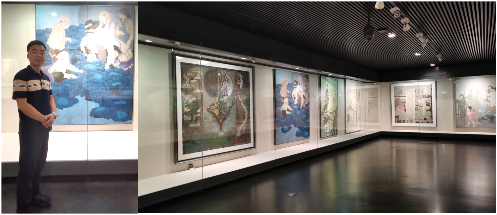 陈建江老师在展览中细致观摩作品,从传统技法到现代创新均获启发。他表示,作品中新型矿物颜料与传统绢本结合产生的独特效果,为其创作提供了新思路。