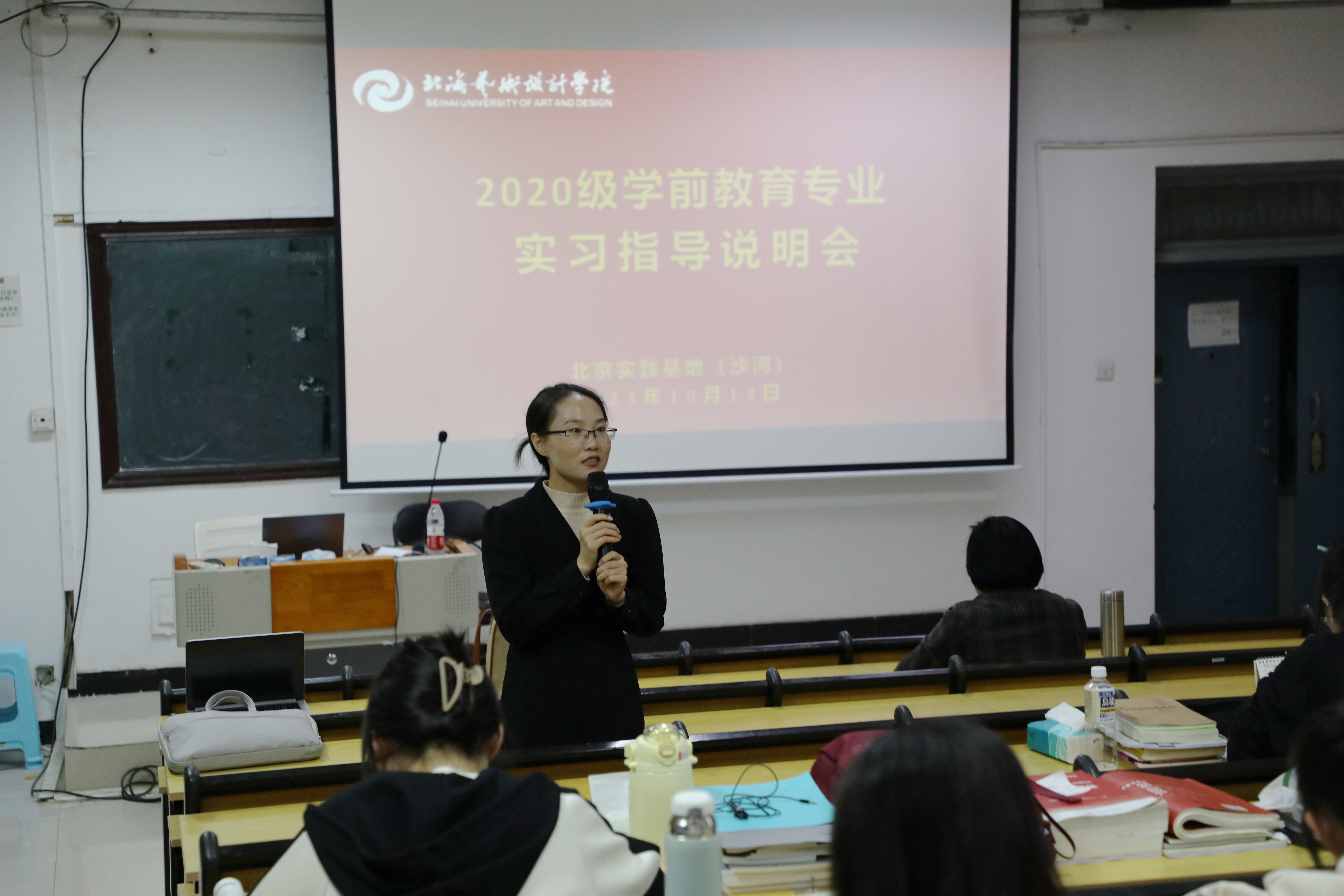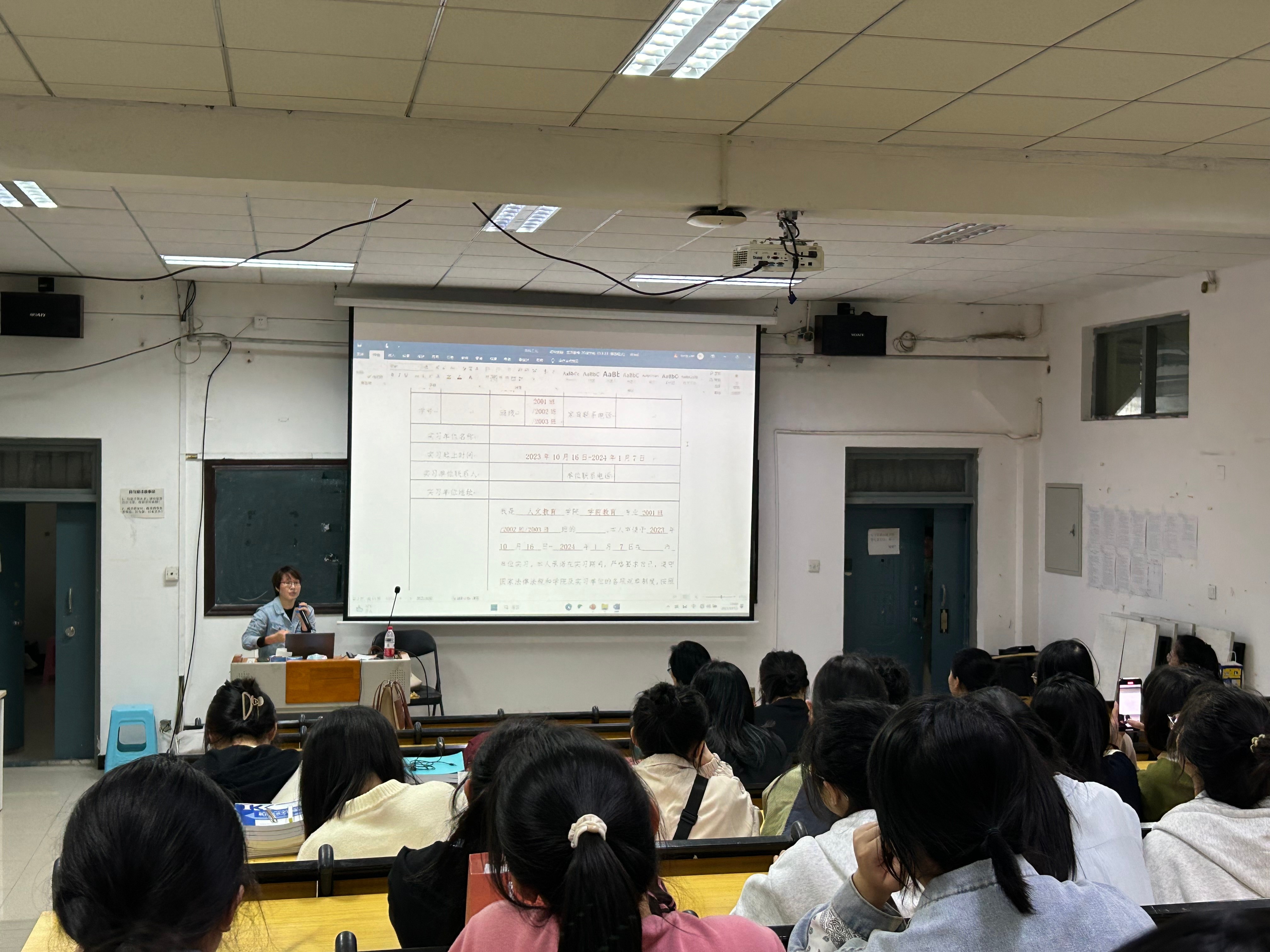 为了扎实做好2024届毕业生实习工作,进一步促进学生对所学知识和技能进行实践运用、总结和深化,引导学生明确毕业实习的目的和意义。2023年10月13日,人文教育学院在北京实践基地(沙河)阶梯教室召开2024届学前教育、舞蹈表演毕业实习指导会。北京实践基地办公室副主任严腾、人文教育学院党总支副书记邓欢、学前教育教研室主任蒙剑英、实验室副主任冯小霞出席会议。