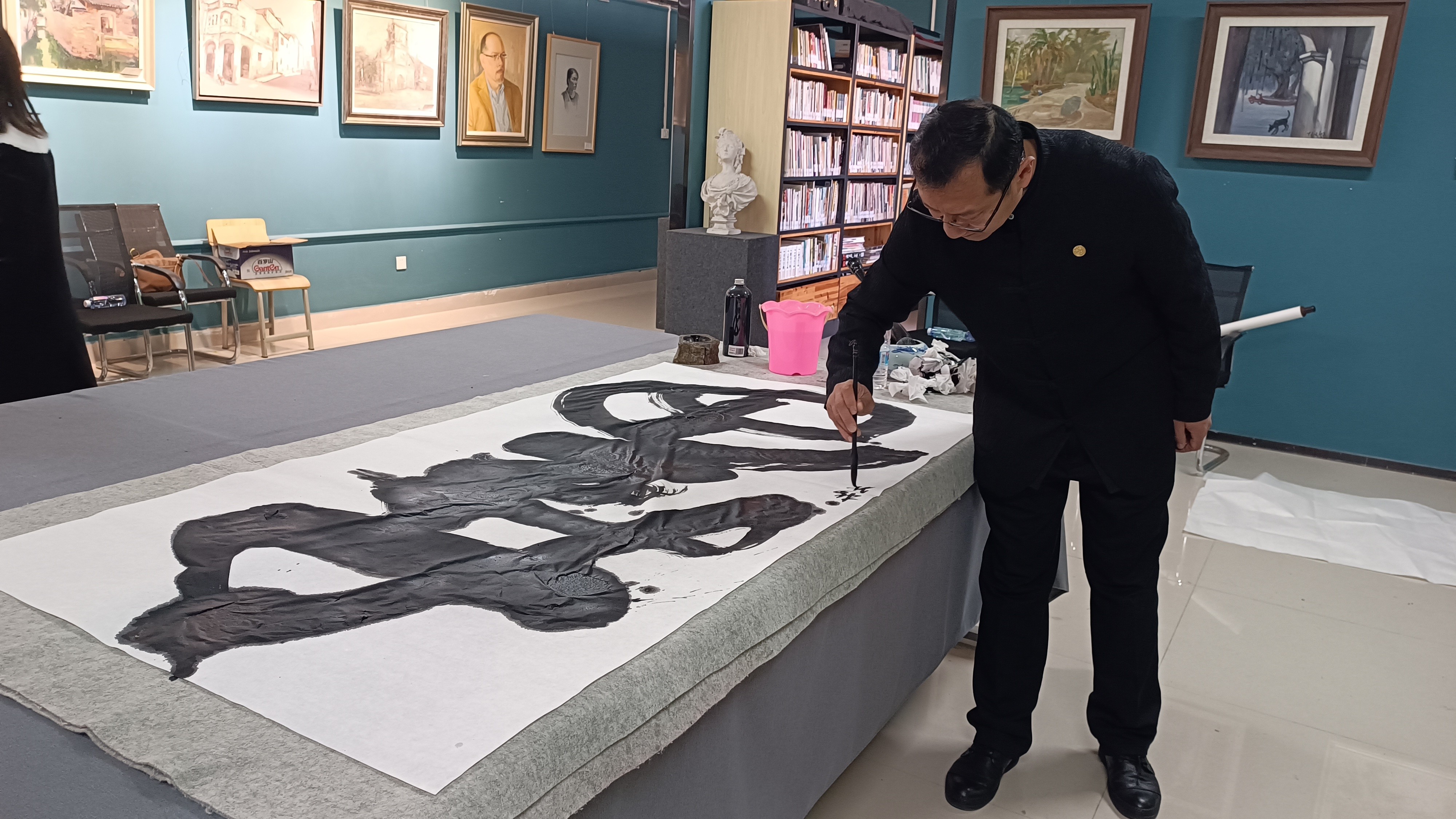 在与书法学专业青年教师的交流与榜书的书写展示中,张树新教授通过书法的多元审美性,探讨其中对美的认知与表现差异导致书法难以形式审美共识的困境。以此进一步展开探讨书法创作中真实与真我、气息与品质、形式与内容相辅相成的关系及其在书写中的重要性。(李东垚、孟丹 摄)
