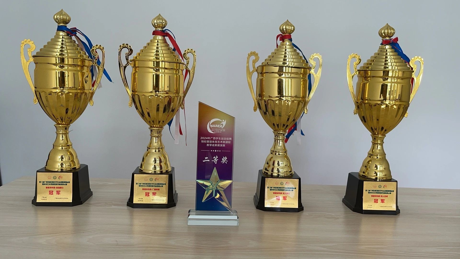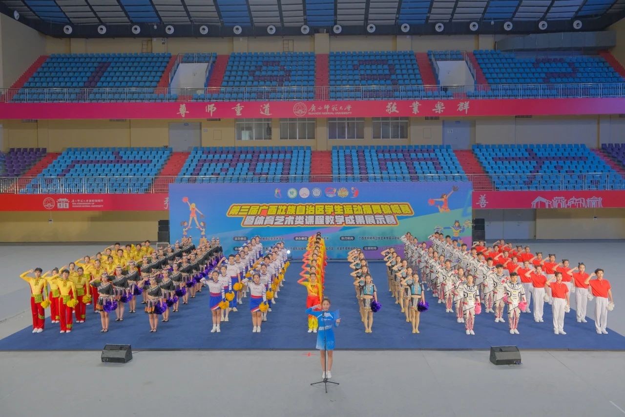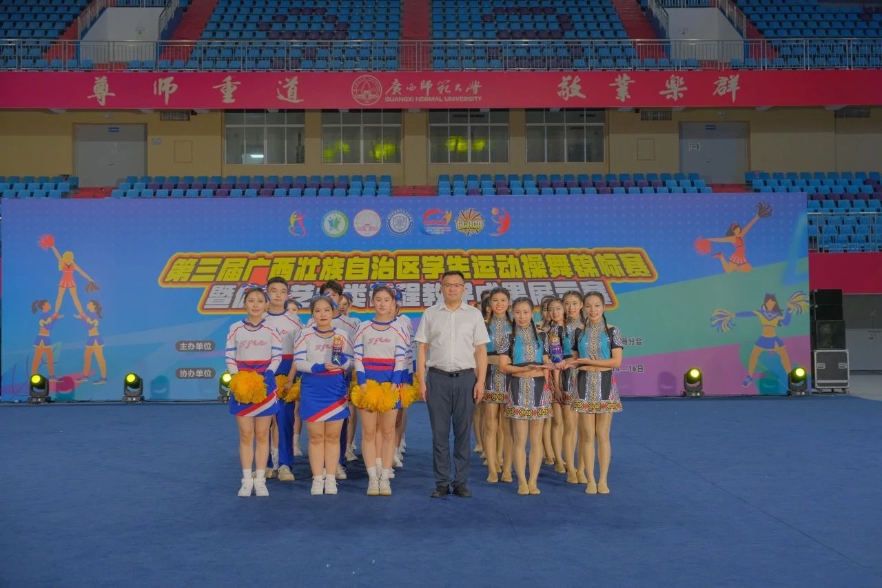 6月14-16日,第三届广西壮族自治区学生运动操舞锦标赛暨体育艺术类课程教学成果展示赛在广西师范大学雁山校区综合体育馆落下帷幕,我校“战马”啦啦操队斩获普通本科组“第九套广播体操、集体爵士自选、双人爵士自选、双人花球自选”4项冠军,民族民间舞季军,同时斩获“体育艺术类课程教学成果展示赛”二等奖。