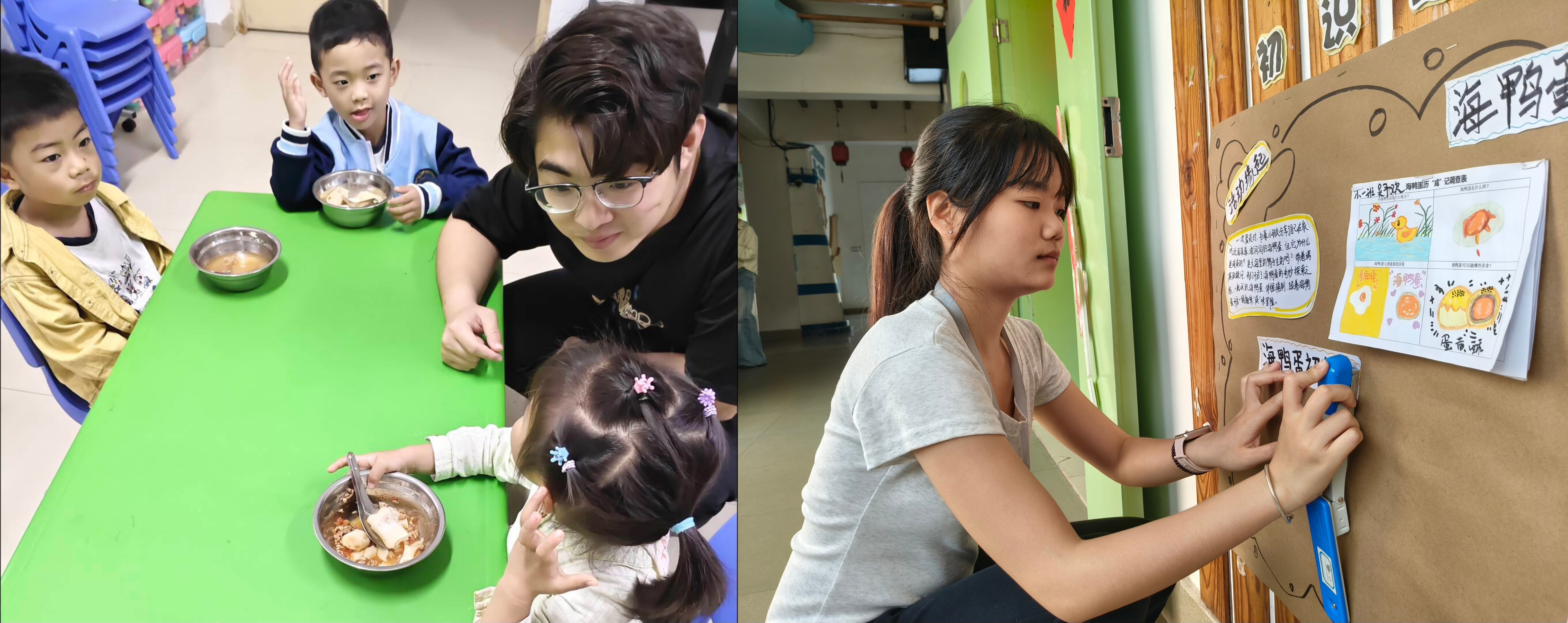 学前2401班丁朝旭同学与幼儿进餐互动     学前2401班覃贞灿同学进行环创